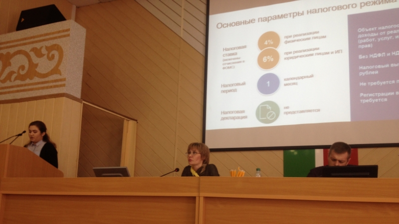 До присутствующих была доведена информация об особенностях, преимуществах применения специального налогового режима, о способах регистрации, о мобильном приложении.