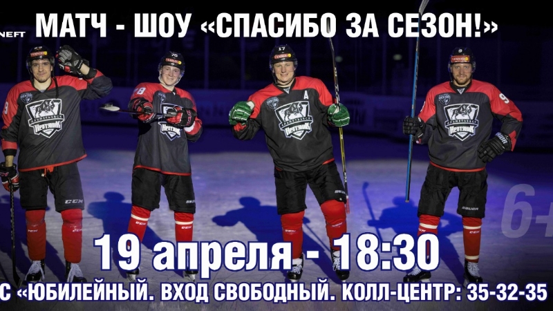 В пятницу, девятнадцатого апреля, в 18.30 во дворце спорта «Юбилейный» пройдет традиционный итоговый шоу-матч «Спасибо за сезон» с участием команды «Нефтяник» и любителей хоккея. Как всегда, будет много интересного.