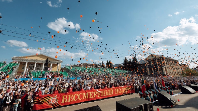 Под гимн «Бессмертного полка» колонна вошла на площадь Ленина. Там альметьевцы выпустили в небо тысячи черных и оранжевых воздушных шаров – цвета Георгиевской ленты, символа Победы - пламени и дыма, воинской доблести и славы.