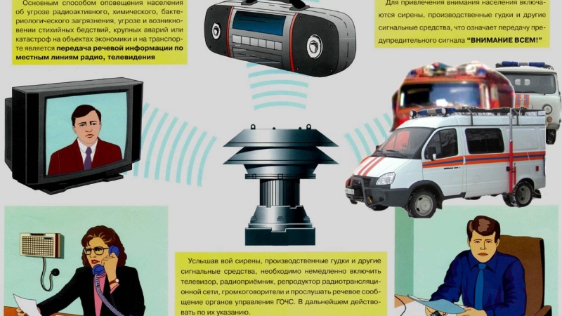 Услышав сигнал, необходимо включить телевизор, радиоприемник, репродуктор радиотрансляционной сети и прослушать сообщение местных органов власти или органов, осуществляющих управление гражданской обороной. В сообщении указывается: факт угрозы, направление распространения зараженного воздуха, населенные пункты, попадающие в зону заражения, характер действий производственного персонала и населения.