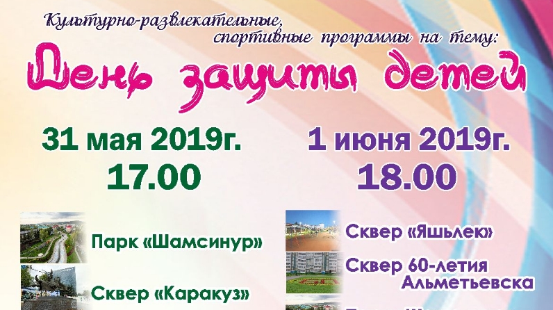 «Культурная среда города» приглашает альметьевцев и гостей города на культурно-развлекательные и спортивные мероприятия 31 мая и 1 июня, посвященные Дню защиты детей.