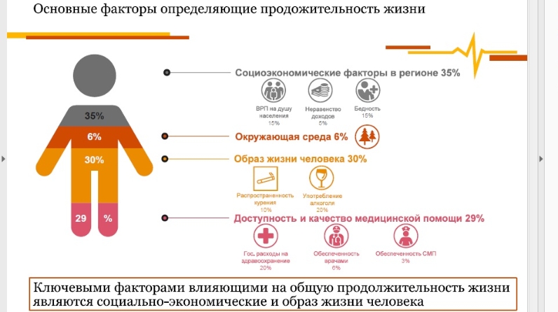 При этом ключевыми факторами, влияющими на продолжительность жизни, согласно исследованиям, являются социально-экономические условия в регионе, образ жизни самого человека, а также доступность и качество медицинской помощи. По словам В.Гераскина, от образа жизни ее продолжительность зависит на 30%, а значит следует не только развивать медицинское обслуживание, но и стимулировать здоровый образ жизни населения.