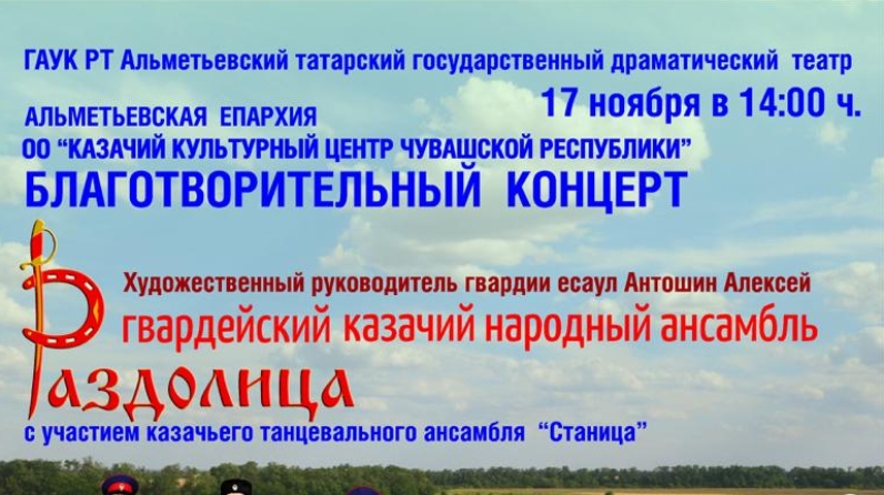 Альметьевская епархия и общественная организация «Казачий культурный центр Чувашской Республики» приглашают альметьевцев и гостей города на благотворительный концерт гвардейского казачьего народного ансамбля «Раздолица» с участием казачьего танцевального ансамбля «Станица».
