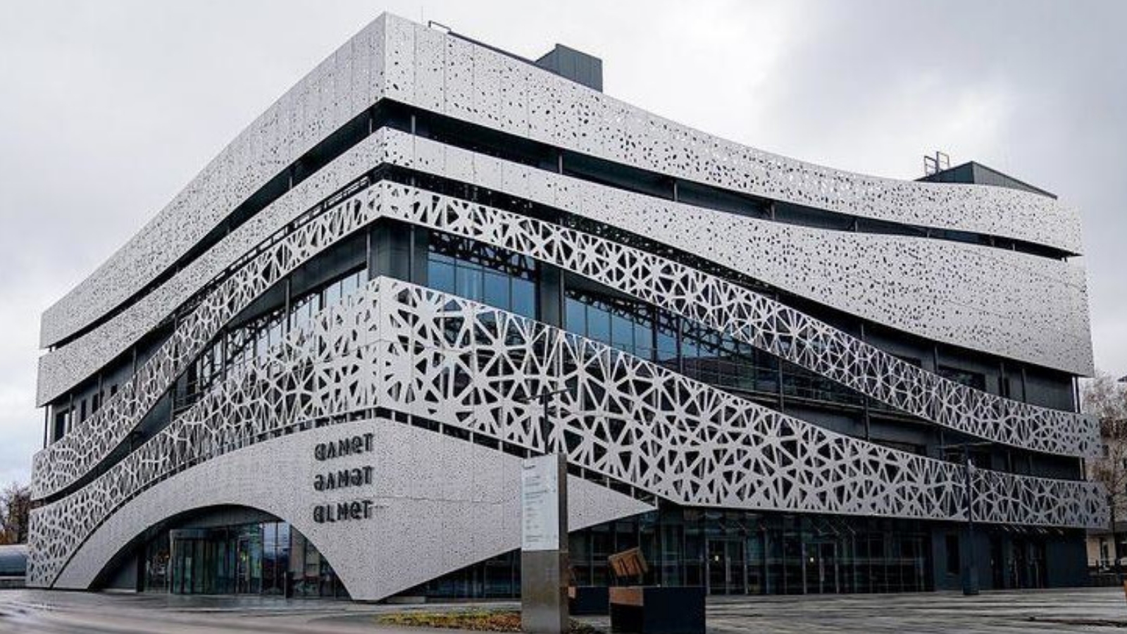 Архитектор центра - Никита Выходцев, руководитель петербургской мастерской «Арканика». «Алмет» - 5-ти этажное здание кубической формы. Навесной перфорированный фасад стилизует последовательность нефтеносных пластов альметьевского района.