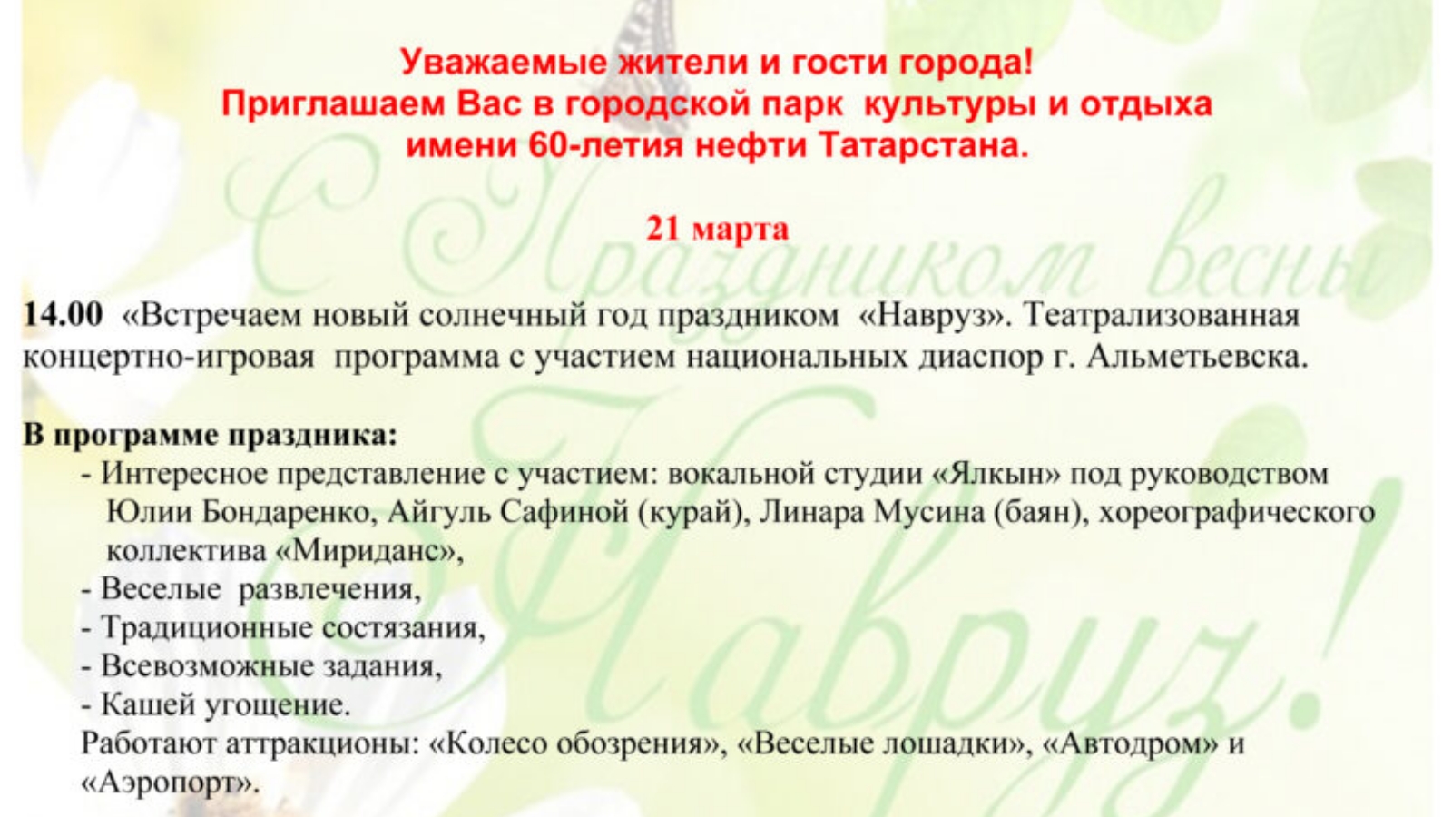 Приглашаем Вас на праздник "Навруз", который состоится 21 марта в городском парке культуры и отдыха имени 60-летия нефти Татарстана.