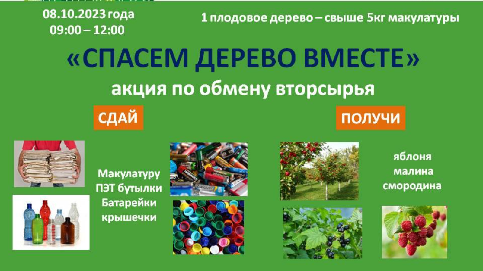 Сдав свыше 5 кг макулатуры участники получают 1 плодовое растение (яблоня, смородина, малина)