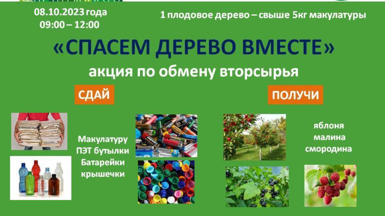8 октября 2023 года С 9.00 до 12.00 МБУ «Департамент экологии и благоустройства» проводит ежегодную акцию «Спасем дерево вместе» по приему вторсырья.