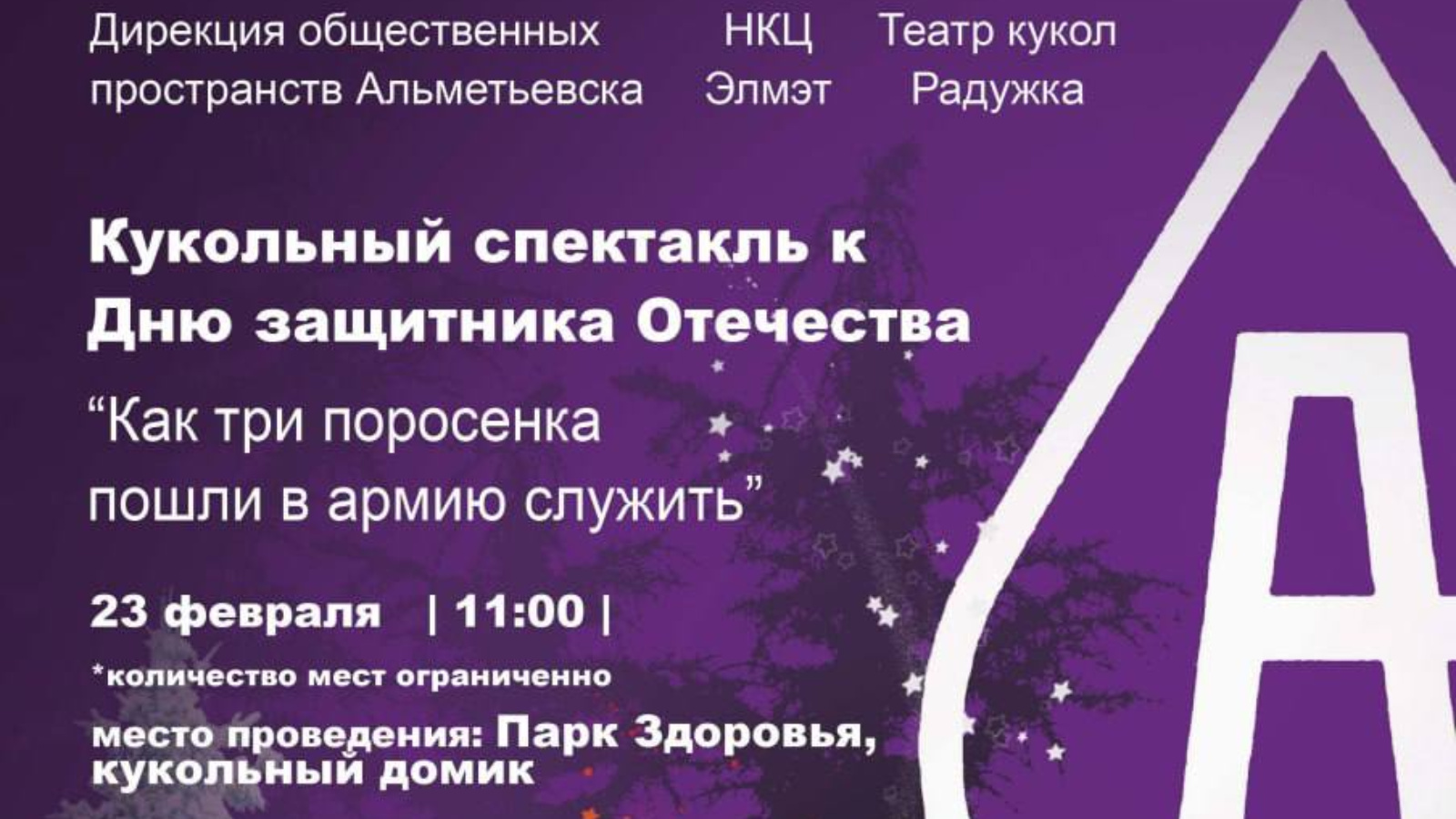 23 февраля в 11:00 в Парке "Здоровье" будет организован показ спектакля "Как три поросенка пошли в армию служить".