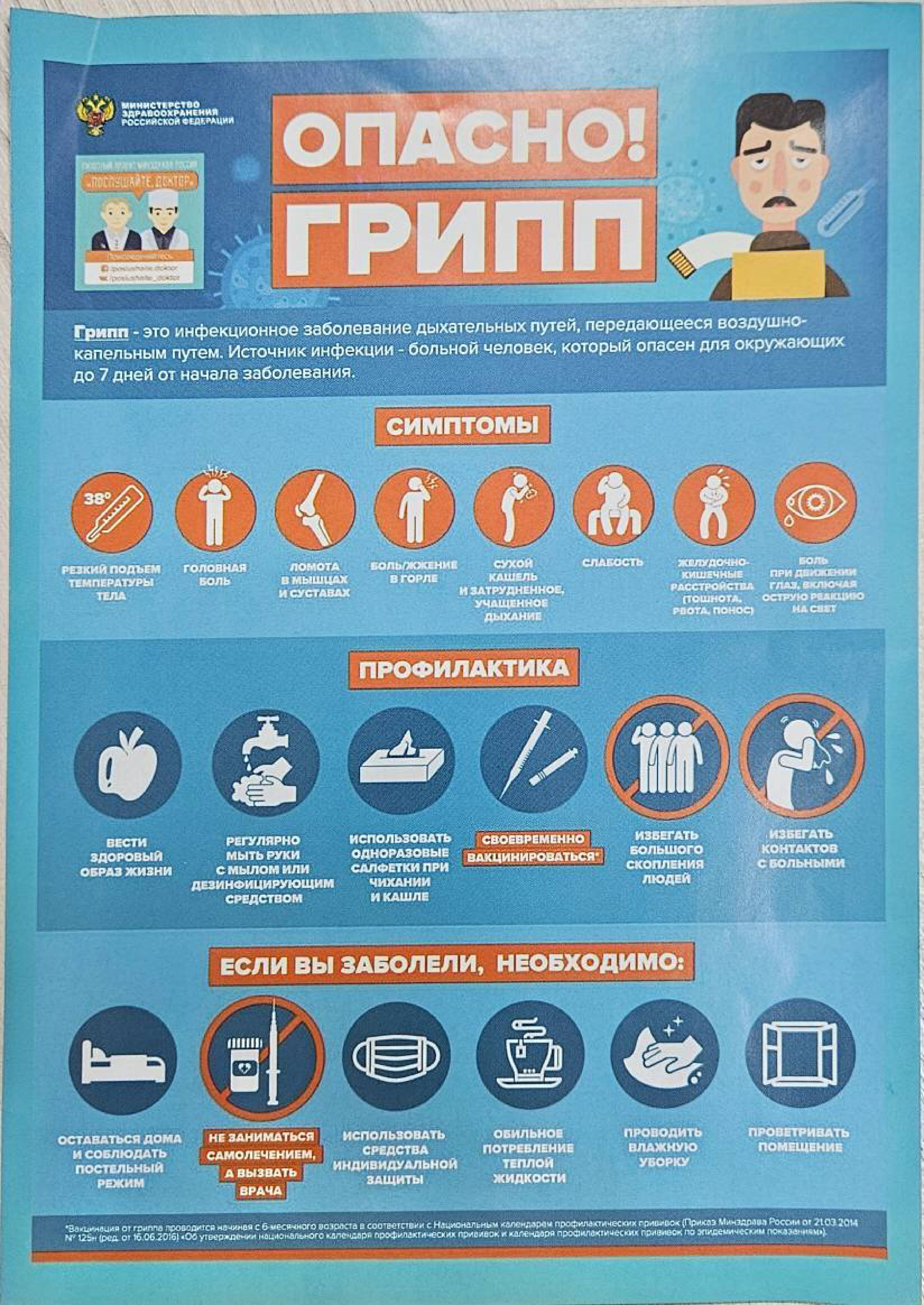 В настоящее время продолжается Всероссийская кампания по вакцинации от гриппа. Роспотребнадзор рекомендует пройти вакцинацию и напоминает, что к группам риска по гриппу относятся люди, которые много работают с населением, пожилые люди, люди с ослабленным иммунитетом, с хроническими заболеваниями, а также маленькие дети. Прививка защищает человека от тяжелых последствий гриппа, снижает риск развития внебольничных пневмоний, помогает иммунной системе выработать защитные антитела для борьбы с инфекцией.