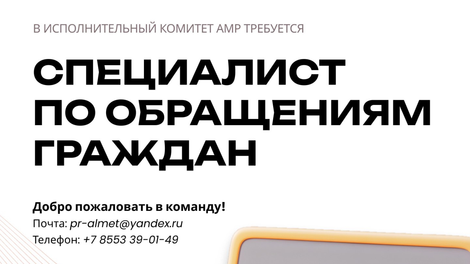 Работа в администрации — это возможность делать наш город современнее и удобнее. Если ты тоже неравнодушен к Альметьевску, хочешь развивать его и развиваться сам, присоединяйся к нашей команде!
