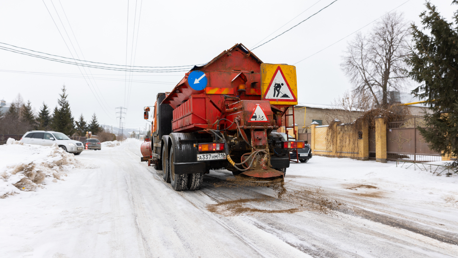 В первую очередь специалисты обрабатывают дороги песчано-солевой смесью, чтобы уменьшить скольжение. Следующим этапом станет работа грейдера, который ликвидирует ледяную колею на дорогах.