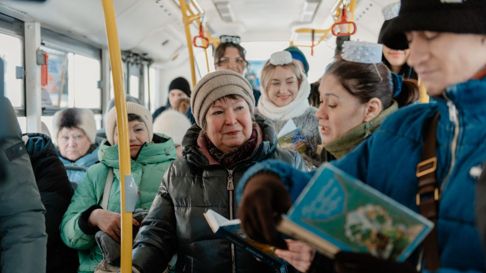 Сегодня в Международный день родного языка в троллейбусе 32, который движется по первому маршруту, артисты театра в рамках проекта «Слово поэта» в очередной раз порадовали пассажиров общественного транспорта своими выступлениями. Они читали стихии пели песни вместе с альметьевцами о родном языке, любви, семье и вечных ценностях.