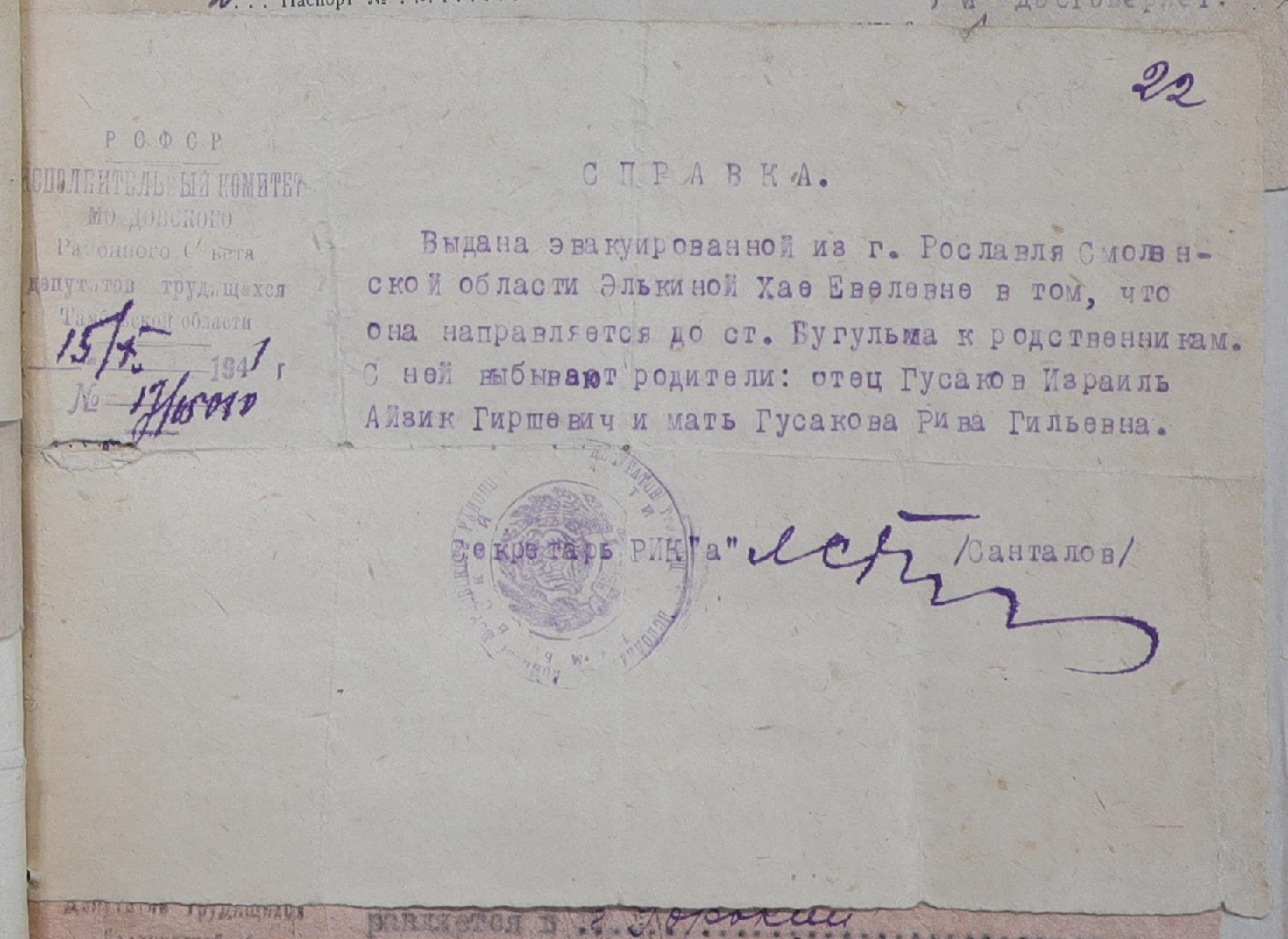 В альметьевском архиве хранятся документы эвакбюро и эвакуированных граждан в район (отчеты, ведомости, направления, списки, удостоверения, справки) за 1941-1943 годы.