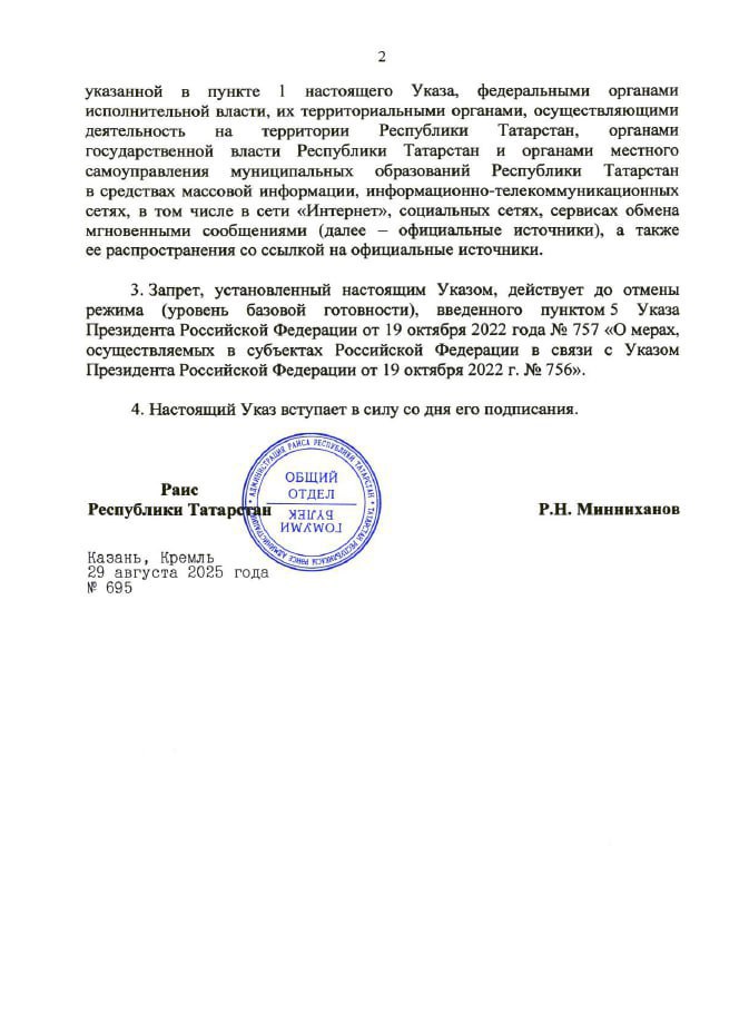 Вышел Указ Раиса Республики Татарстан о запрете распространения в СМИ, сети Интернет, социальных сетях, мессенджерах фото и видео полетов БПЛА, а также возможных последствий их атак.