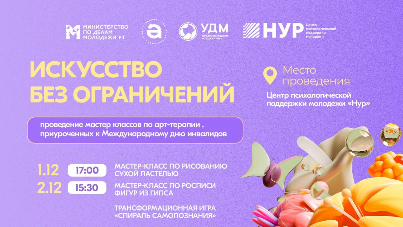 К Международному дню инвалидов в Центре психологической поддержки молодежи «Нур» с 1 по 5 декабря включительно пройдет серия арт-терапевтических мастер-классов под названием «Искусство без ограничений».