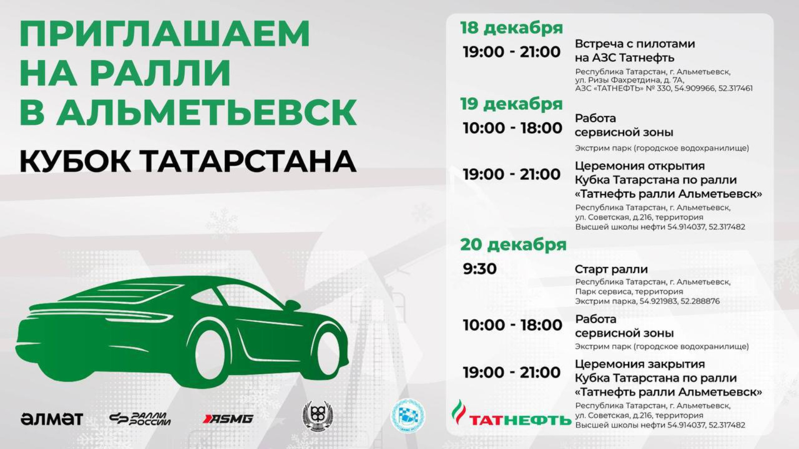 В Альметьевске и Альметьевском районе с 18 по 20 декабря пройдёт «Татнефть ралли Альметьевск» — масштабное соревнование с участием сильнейших автогонщиков страны и региона. Участникам предстоит преодолеть около 300 км трассы, из них 60 км — скоростные спецучастки.