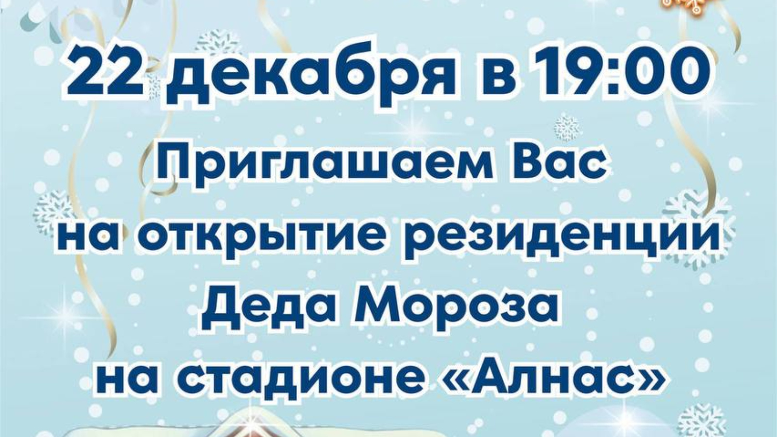 Сегодня в 19:00 на стадионе «Алнас» свои двери открывает резиденция Деда Мороза. Самое время вместе с детьми выбрать любимые стишки, вспомнить новогодние песенки и настроиться на праздник.