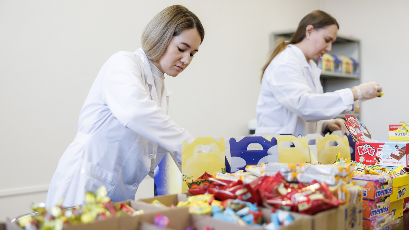 Каждый набор собран в праздничную коробку и включает конфеты, шоколад, мармелад, джем и другие сладости. Общий вес подарков от БФ «Нэфис» составляет 10,4 тонны.