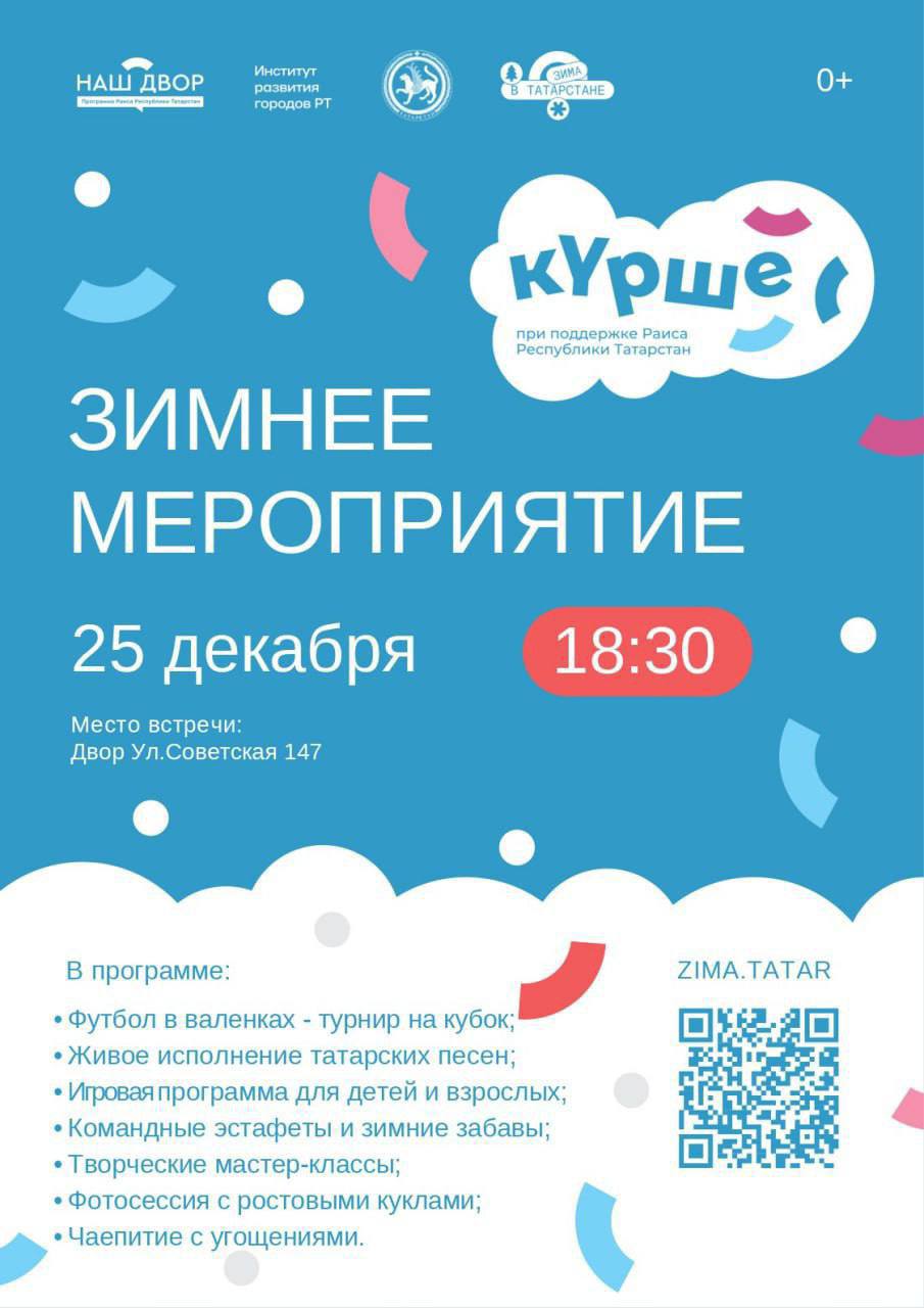 Гостей ждут увлекательные командные эстафеты, захватывающие игры на меткость, азартный футбол в валенках и интересные творческие мастерские. Особую атмосферу зимнего волшебства создадут живые выступления с татарскими песнями, веселые аниматоры и любимые зимние персонажи, которые подарят незабываемые впечатления и отличное настроение.