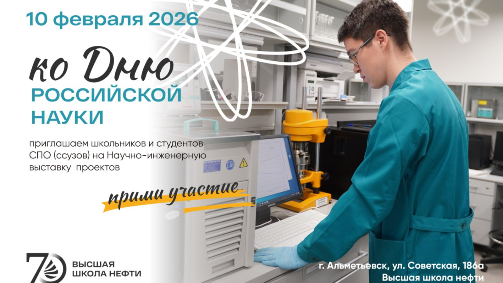10 февраля 2026 года Высшая школа нефти приглашает школьников и студентов СПО (ссузов) в возрасте от 12 до 20 лет на грандиозную Научно-инженерную выставку проектов, приуроченную ко Дню российской науки.