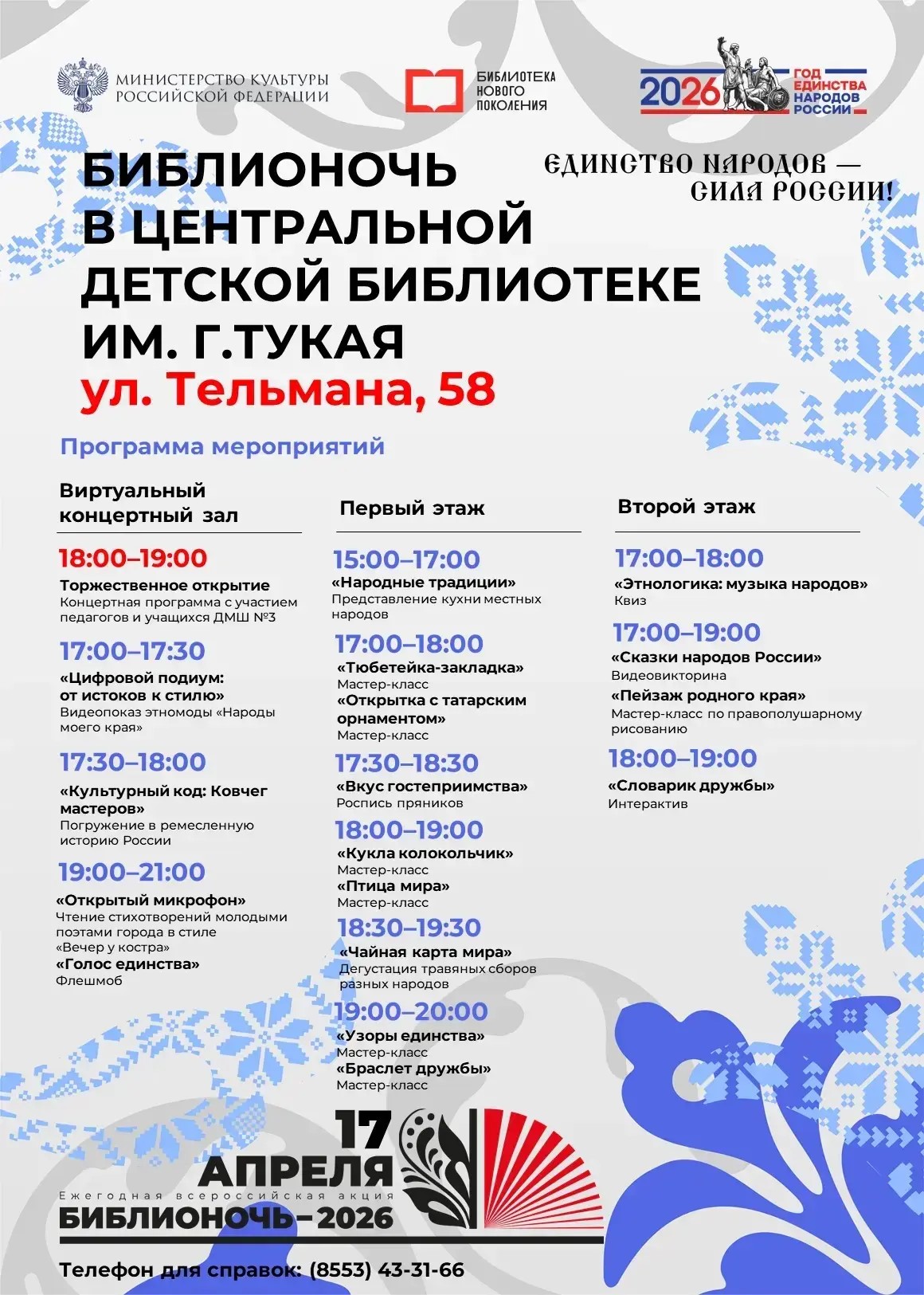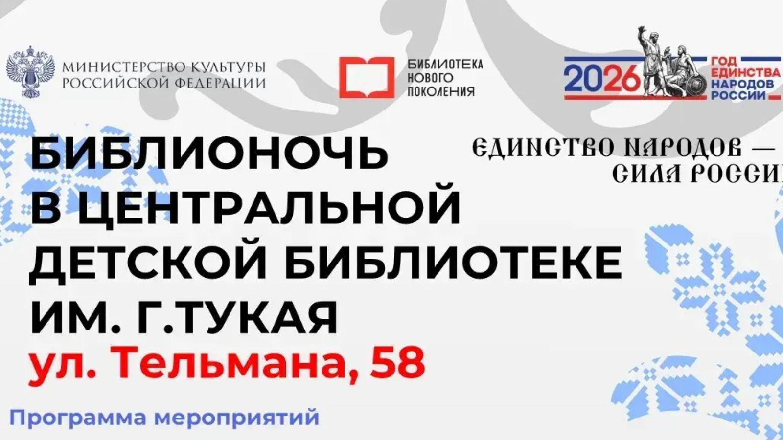 17 апреля Центральная детская библиотека им. Г. Тукая присоединится к ежегодной всероссийской акции «Библионочь-2026», которая в этом году проходит под девизом: «Единство народов — сила России!».