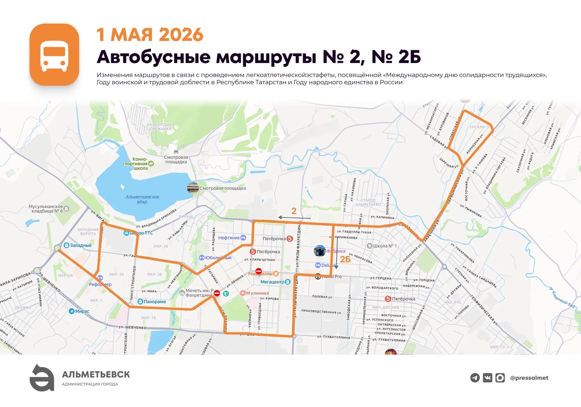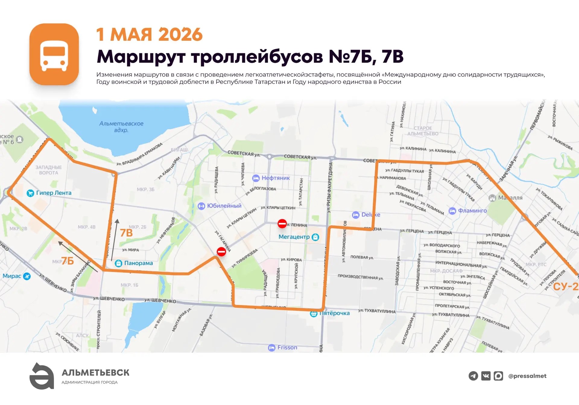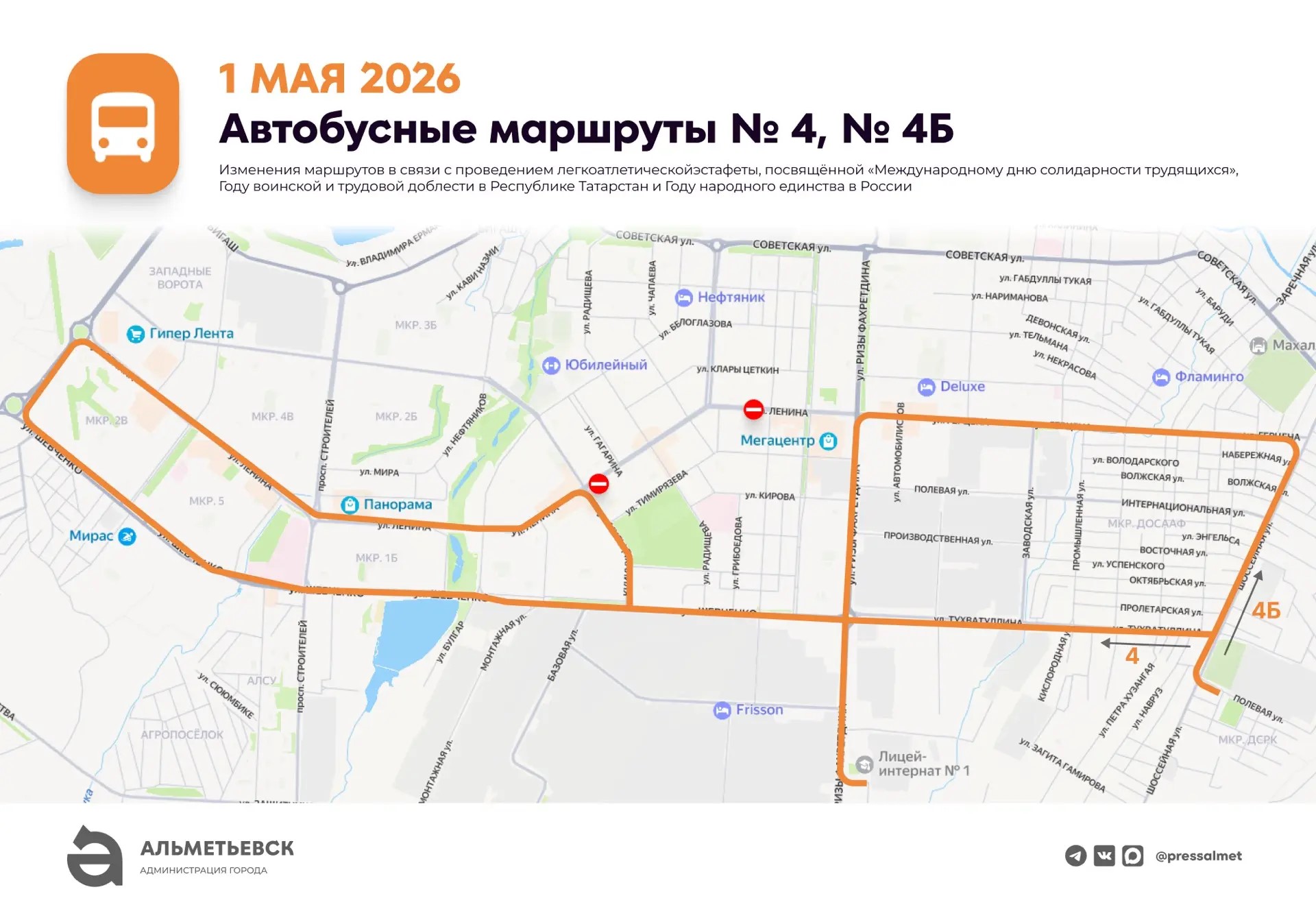1 мая в связи с проведением 66-й легкоатлетической эстафеты с 09:00 до 14:00 часов будет перекрыто движение по улице Ленина (от ул. Джалиля до ул. Маяковского), а также выезды на улицу Ленина с улиц Гагарина, Радищева, Пушкина, Чехова, Островского.