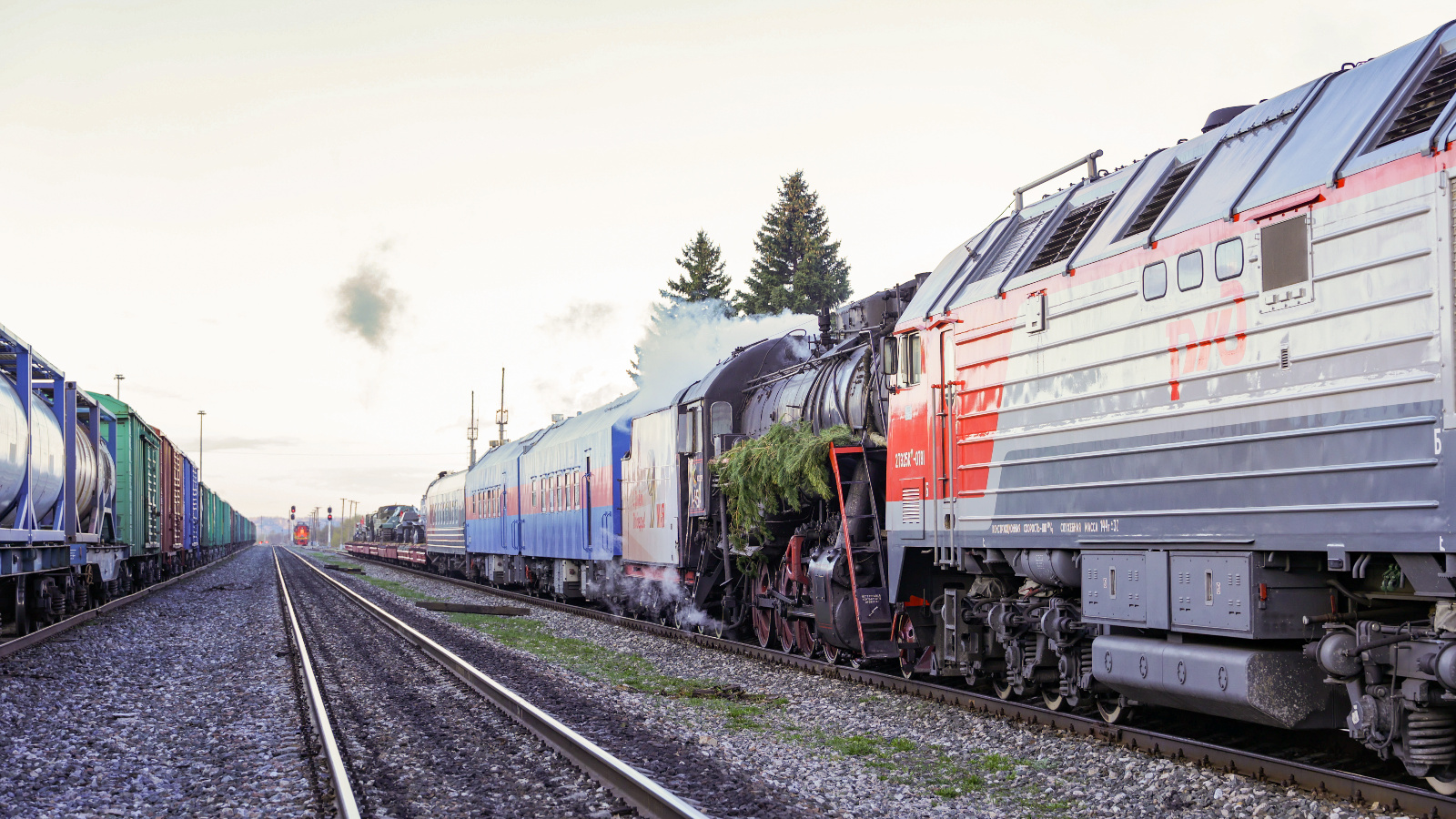 Ровно в 16:35 легендарный паровоз «Лебедянка» зашёл на перрон станции «Альметьевская». За ним — 12 платформ с военной техникой. Та самая техника, которая помнит огонь, дым и долгожданное «Победа!».