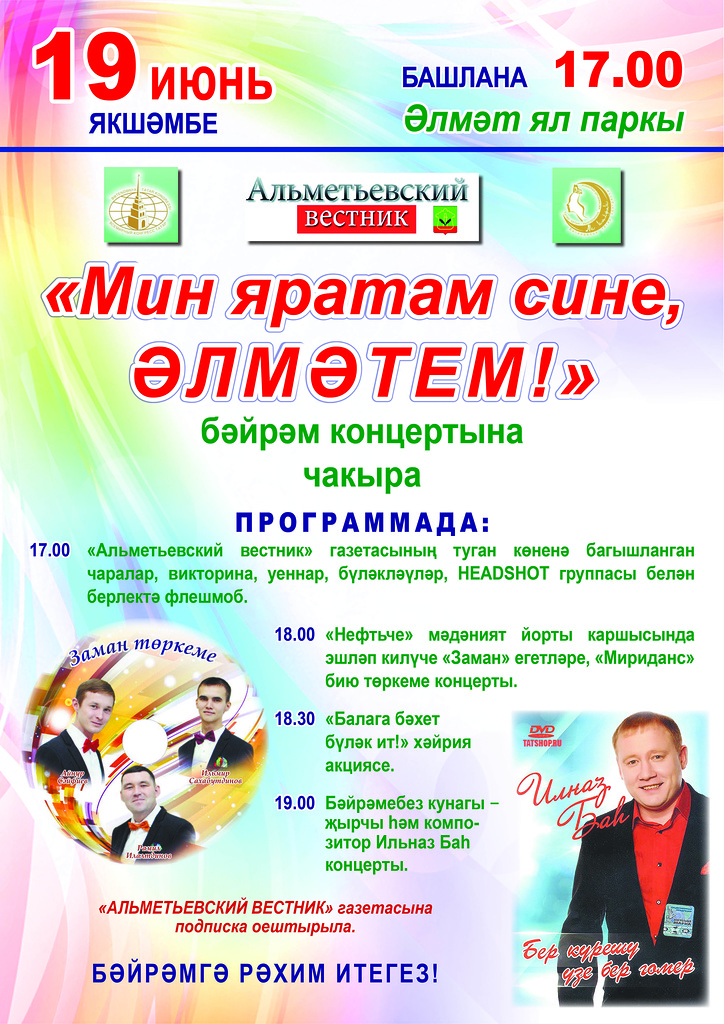 19 июня в 17.00 часов в городском парке имени 60-летия нефти Татарстана состоится праздничное мероприятие “Мин яратам сине, Әлмәтем!”, посвященное 19-летию газеты “Альметьевский вестник”.