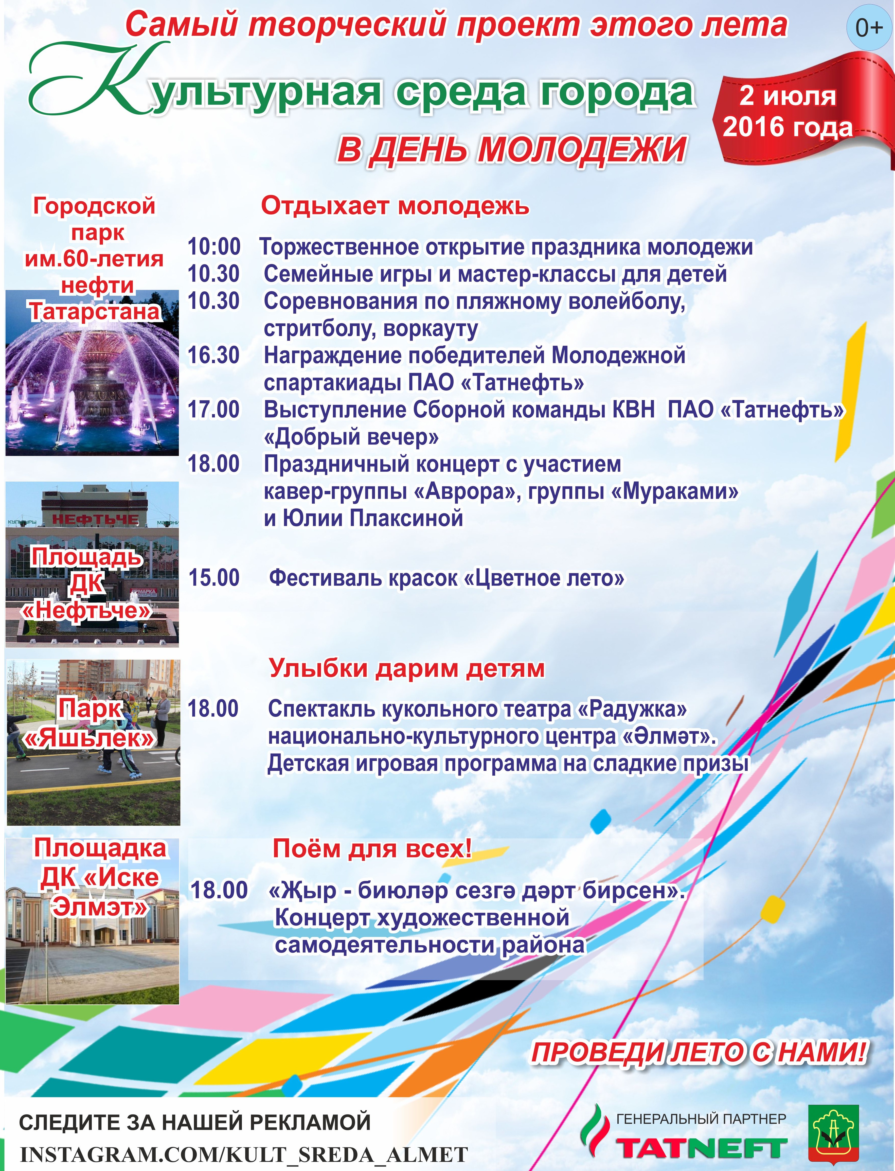 Сегодня в Альметьевске проходит празднование Дня молодежи. Творческий проект «Культурная среда города» стартовавший 18 июня при поддержке ПАО «Татнефть» и муниципалитета предлагает альметьевцам и гостям города ряд развлекательных мероприятий, которые пройдут на нескольких площадках города.