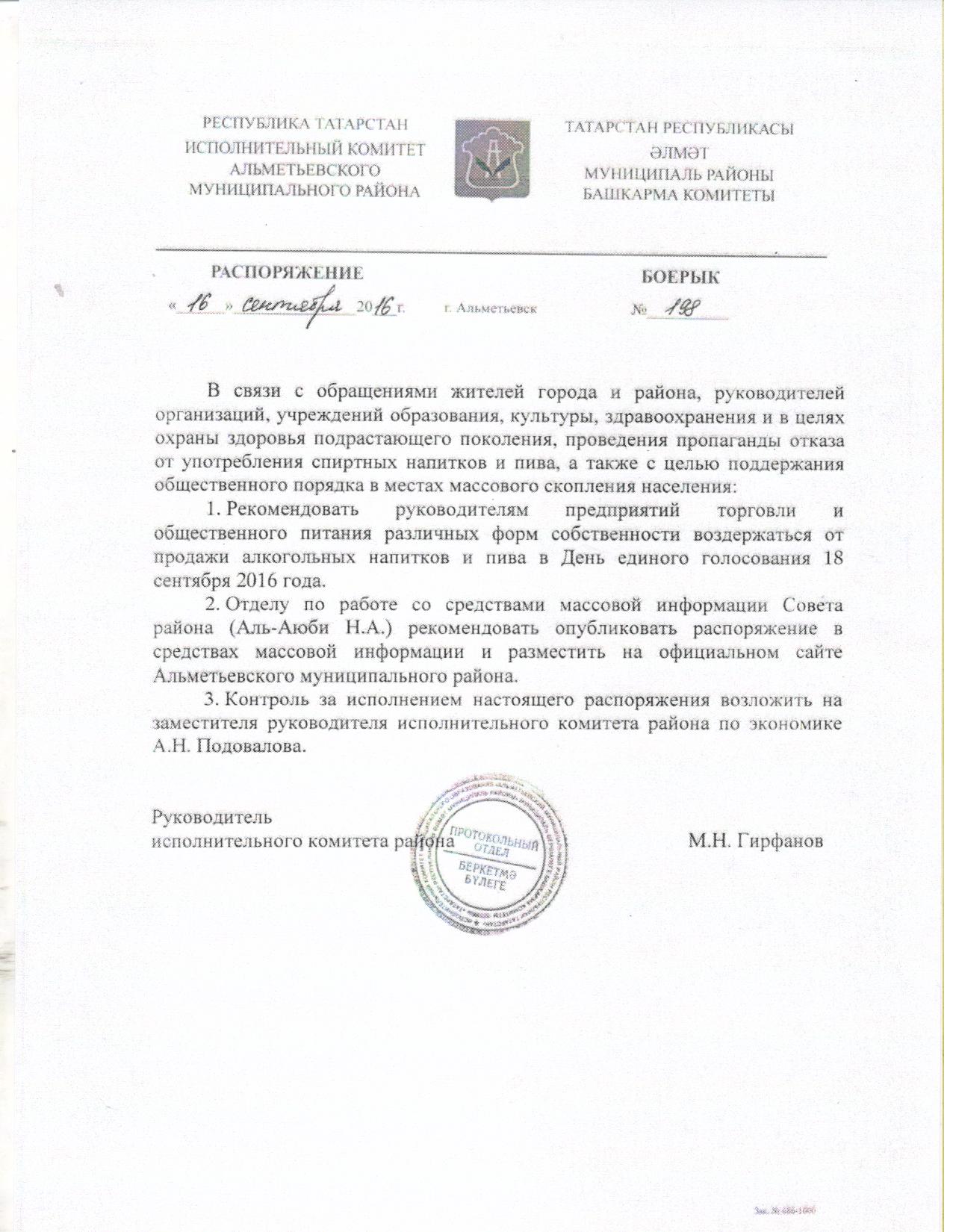 В целях охраны здоровья подрастающего поколения, проведения пропаганды отказа от употребления спиртных напитков и пива, а также в целях поддержания общественного порядка в местах массового скопления населения исполнительный комитет Альметьевского муниципального района рекомендует воздержаться от продажи алкогольных напитков и пива в День единого голосования 18 сентября.
