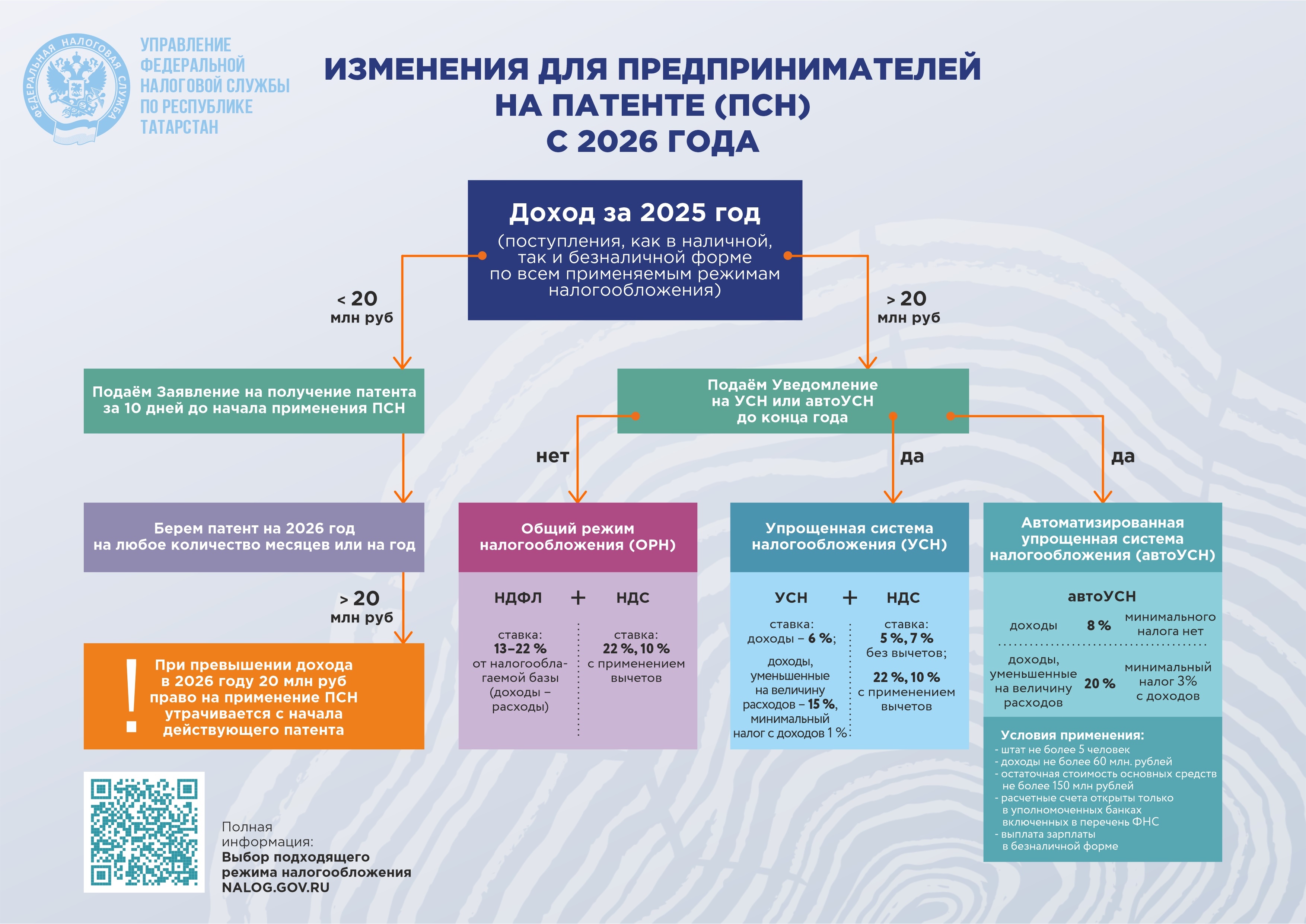 Предпринимателям, чьи поступления в 2025 году превысят порог в 20 млн, необходимо до 1 января выбрать иную систему налогообложения — например, упрощённую (УСН) или автоматизированную УСН. В случае, если налогоплательщик не подаст заявление на УСН или автоУСН, то он автоматически будет считаться плательщиком общего режима налогообложения. Те, кто соответствует новому лимиту и планирует работать на ПСН с 1 января 2026 года, должны подать заявление в налоговую не позднее, чем за 10 рабочих дней до начала применения патента. Сделать это можно через личный кабинет налогоплательщика, что также даст возможность скачать готовый документ, или иным удобным способом. Рассчитать предварительную стоимость патента поможет онлайн-калькулятор ФНС России.