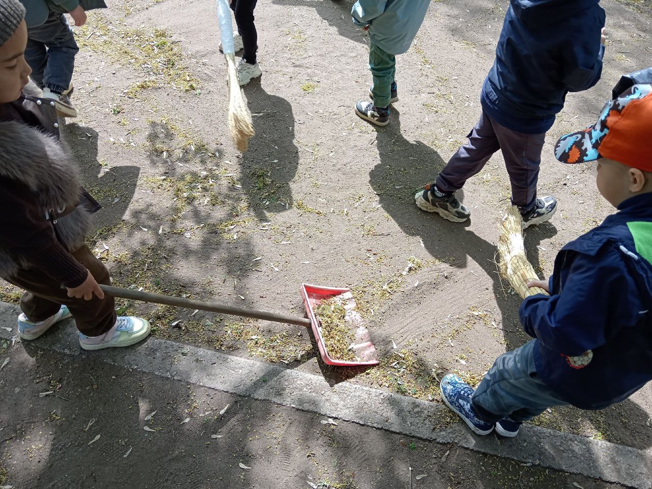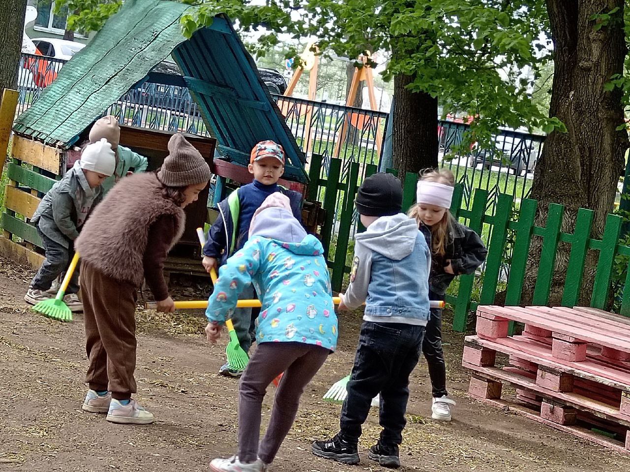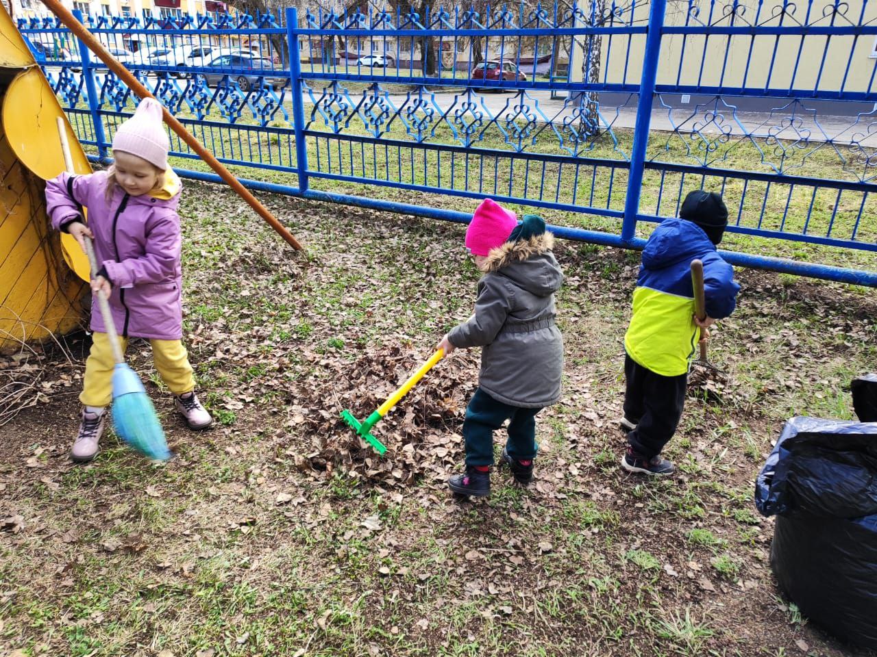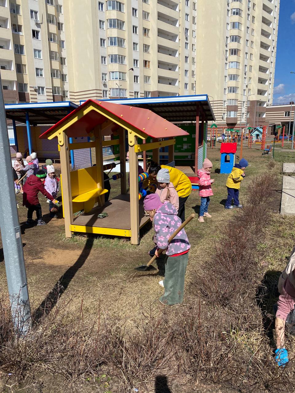Территория детского сада №44 "Росинка" очень большая, много деревьев, выходили на уборку по несколько раз в неделю.