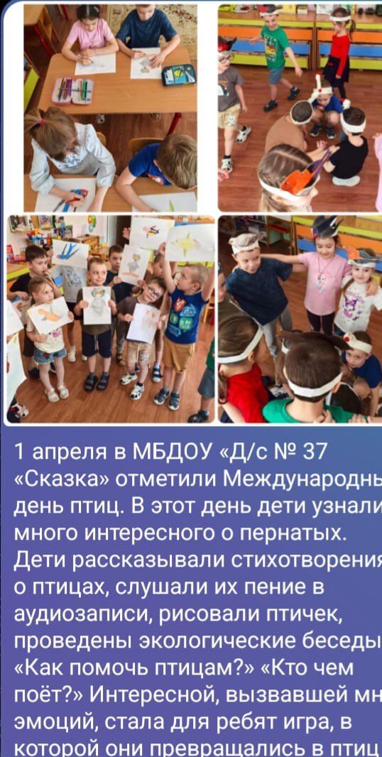 МБДОУ N 33 "Незабудка" педагоги на протяжении дня беседовали с детьми о птицам, читали рассказы, прослушали птичьи голоса, играли в подвижные игры, провели наблюдения на прогулке.