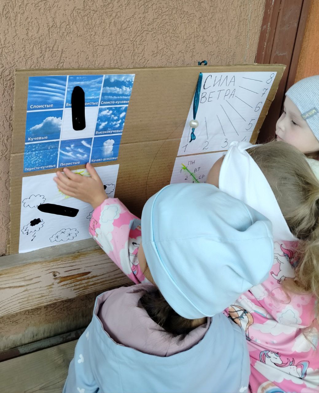 Очень нравится маленьким почемучкам посещать нашу мини-метеостанцию, на которой расположены различные приборы и приспособления для измерения и предсказывания погоды. Вот и сегодня дети наблюдали за переменчивой погодой в течение дня...