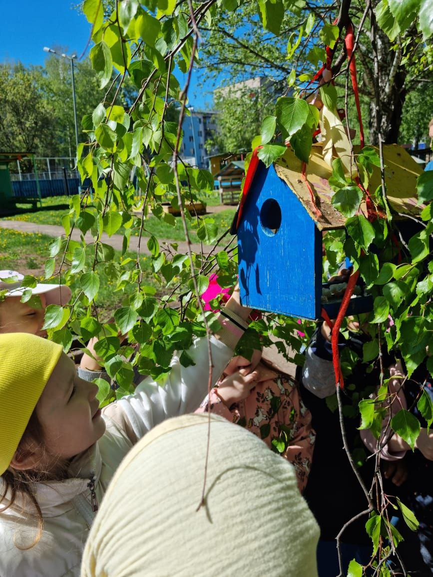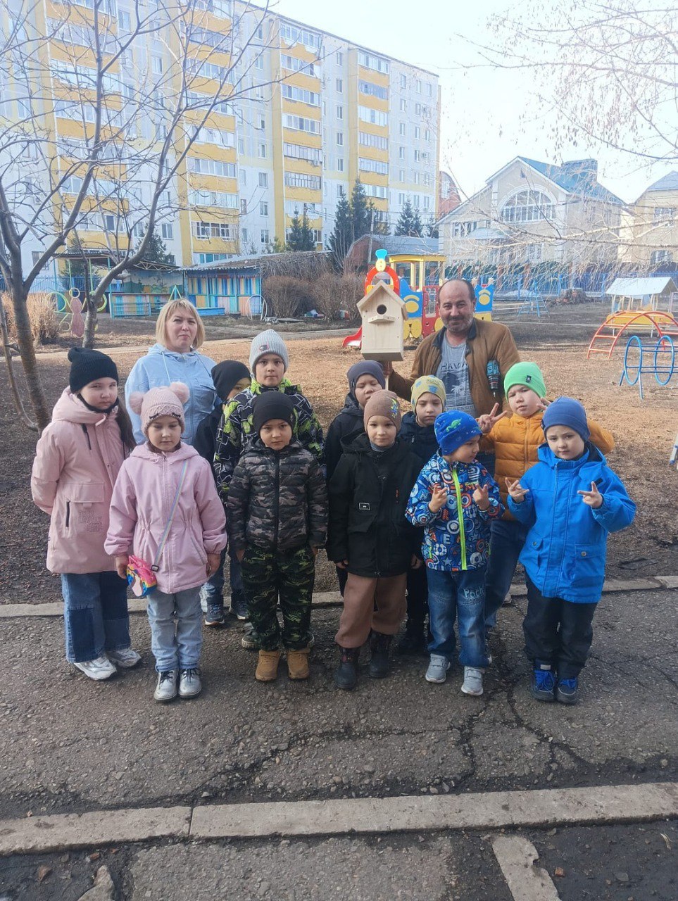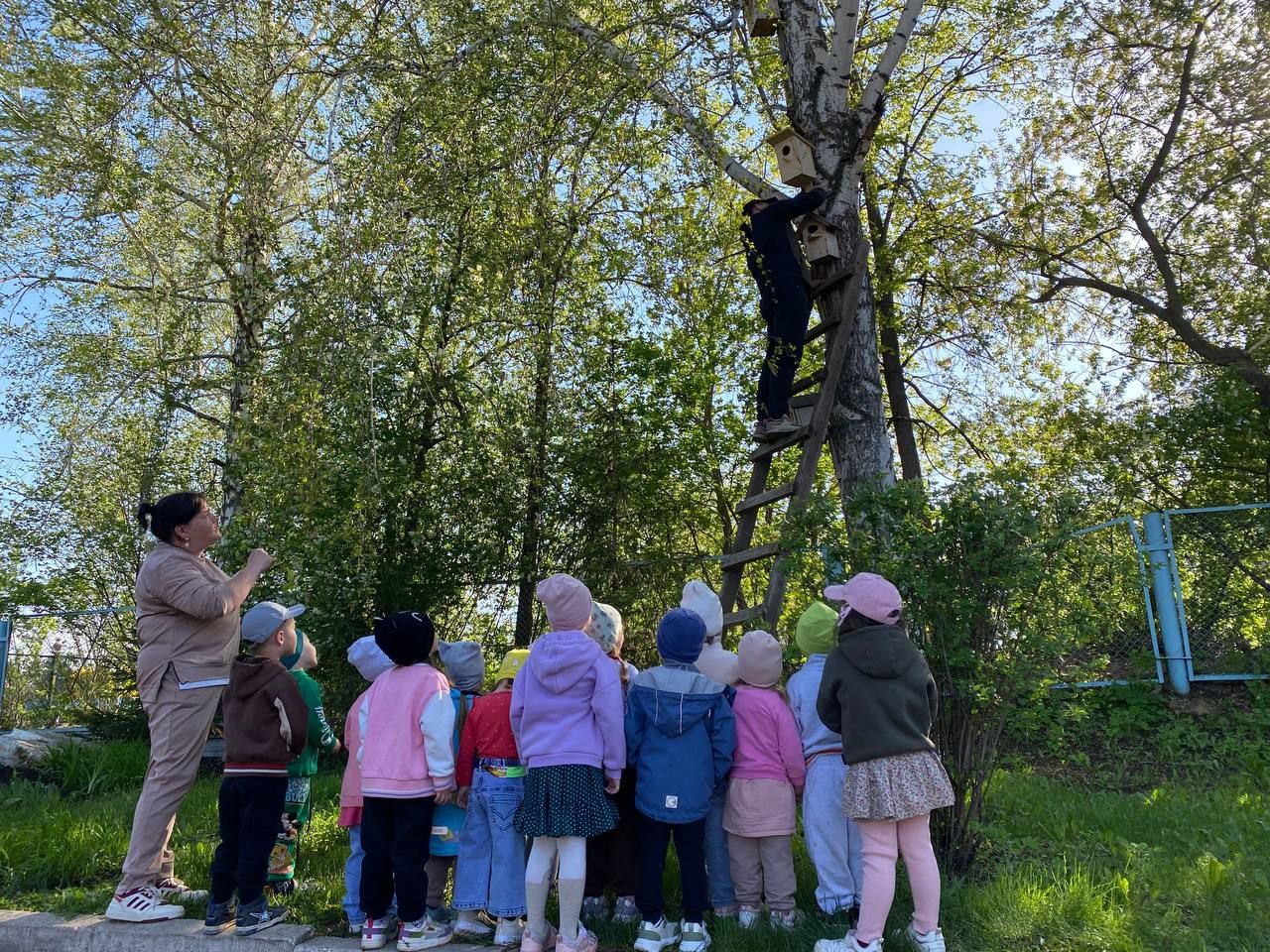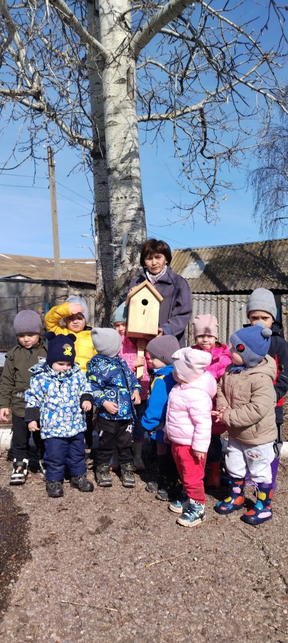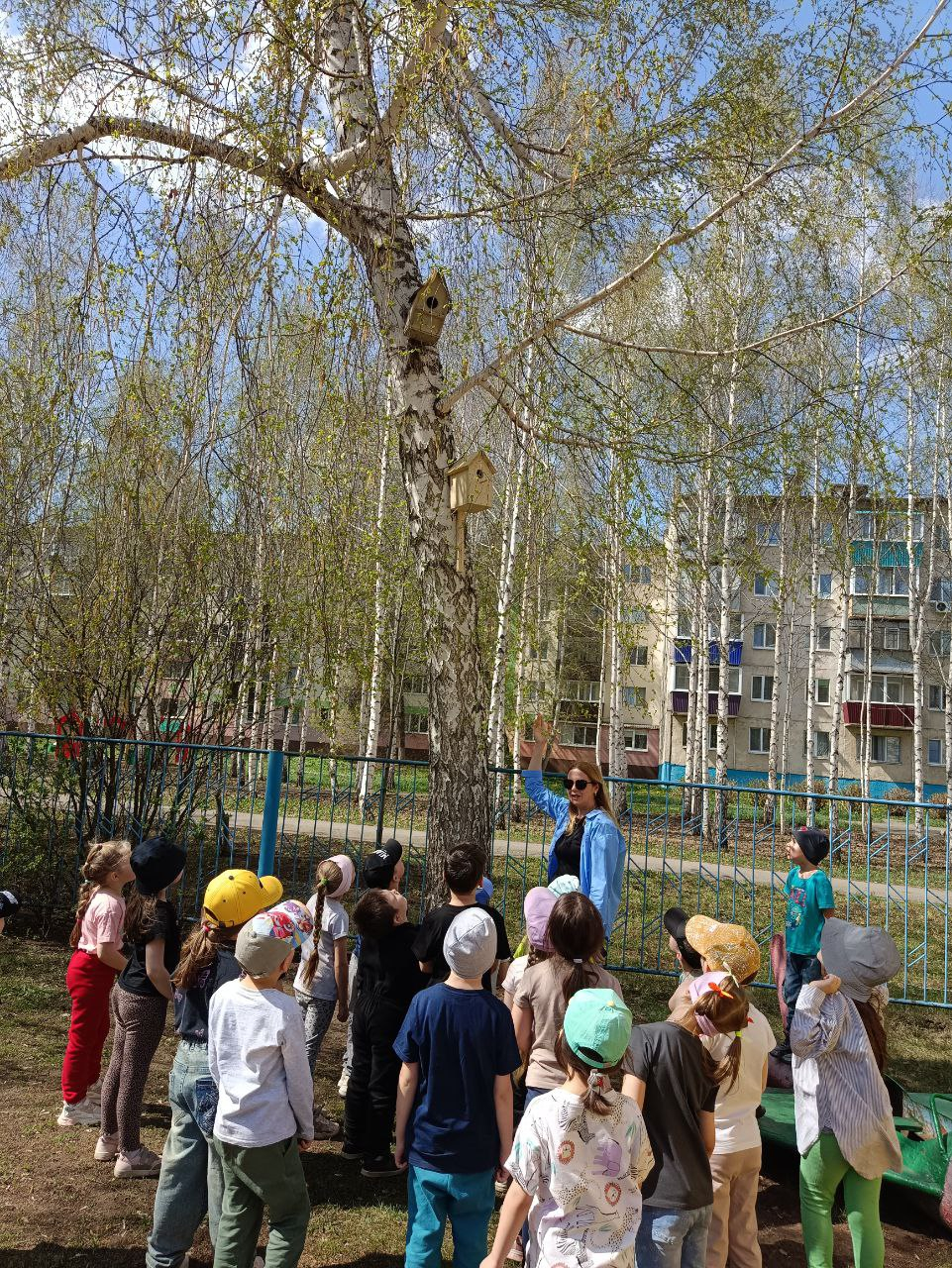 Международный день птиц МБДОУ «Тирэк» с.Урсалабаш. В нашем саду в День птиц , с помощью родителей подвесили новые скворечники. Дети вышли на улицу, рассмотрели устройство домика и наблюдали за процессом его установки. Воспитатели рассказали о роли птиц в природе , пользе для людей и почему им нужны домики. Наши пернатые друзья , нашли свой дом. А также была проведена викторина вопрос-ответ, для закрепления и расширения представления детей о птицах нашего края.