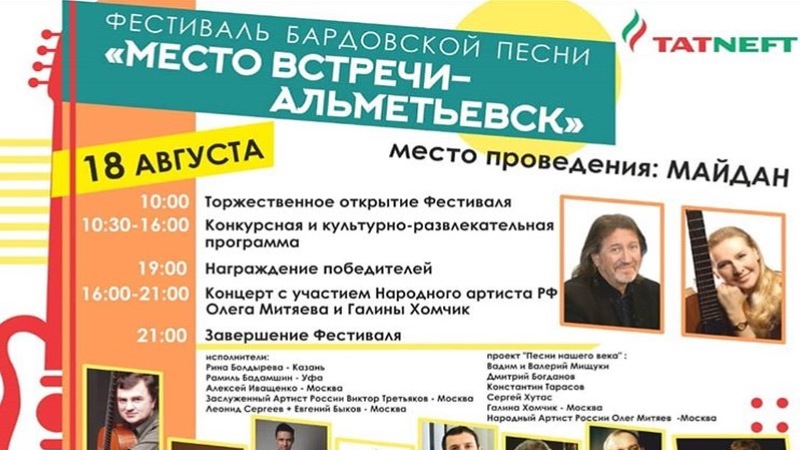 18 август көнне шәһәр мәйданында «Место встречи – Альметьевск» бард җыры фестивале узачак. Башлан сәг. 10.00, РФ Халык артистлары Олег Митяев һәм Галина Хомчик конөерты сәг. 16.00 башлана.