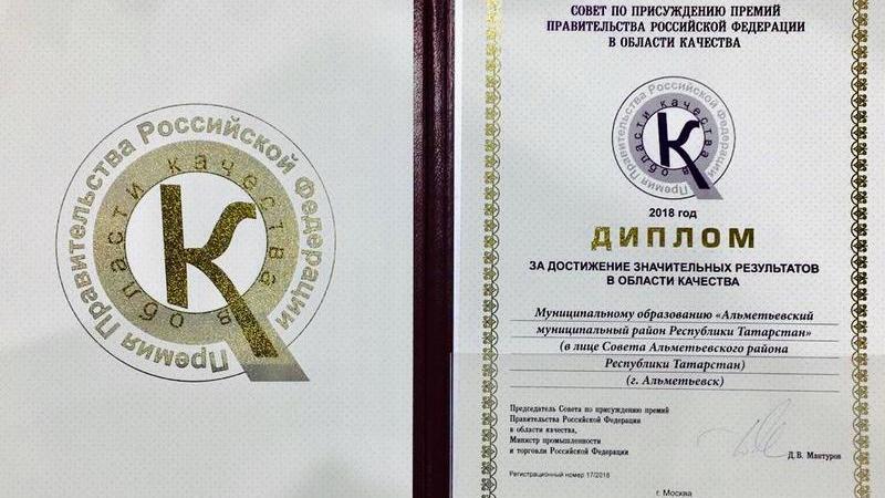 Бу премия ел саен продукция һәм күрсәтелә торган хезмәтләр сыйфатлы өлкәсендә зур нәтиҗәләргә ирешкән һәм югары нәтиҗәле сыйфат менеджменты нәтиҗәле алымнар керткән оешмаларга бирелә. Әлмәт районы “РФ Хөкүмәте премиясе” бәйгесендә катнашып дипломант булды.