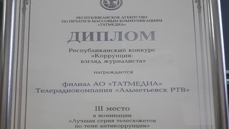 «Альметьевск ТВ» телекомпаниясе «Коррупциягә каршы көрәшү темасыны кагылышлы иң яхшы телесюжетлар сериясе» номинациясендә өченче урынны яулады.