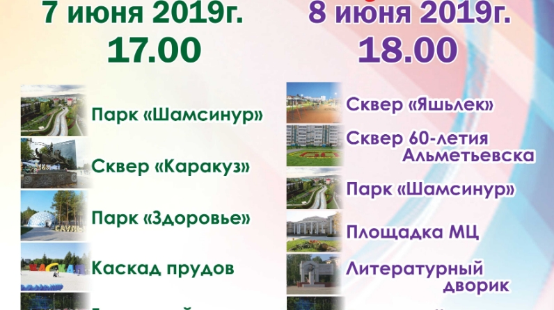 8 июнь көнне бәйрәм чаралары “Яшьлек” һәм Әлмәтнең 60 еллыгы исемендәге скверында, “Шәмсенур” паркында, Яшьләр үзәге мәйданчыгында, шәһәр пляжында һәм “Әдәби ишегалды” скверында үтәчәк. Чаралар 18.00 сәгатьтә башлана.