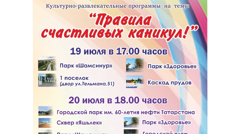 19 июль көнне "Шәһәрдә мәдәни мохит" проекты кысаларындагы чаралар “Саулык” һәм “Шәмсенур” паркларында, шарлавыклы буаларда һәм 1 поселокта (Тельмана урамы, 51 йортының ишегалды) үтәчәк. Чаралар 17.00 сәгатьтә башлана.