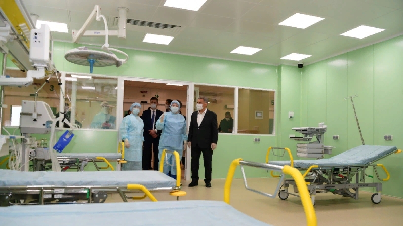 Бүген Әлмәткә эш сәфәре кысаларында Татарстан Республикасы Президенты Рөстәм Миңнеханов җирле онкология диспансерында радиология корпусы төзелешенең барышы белән танышты.