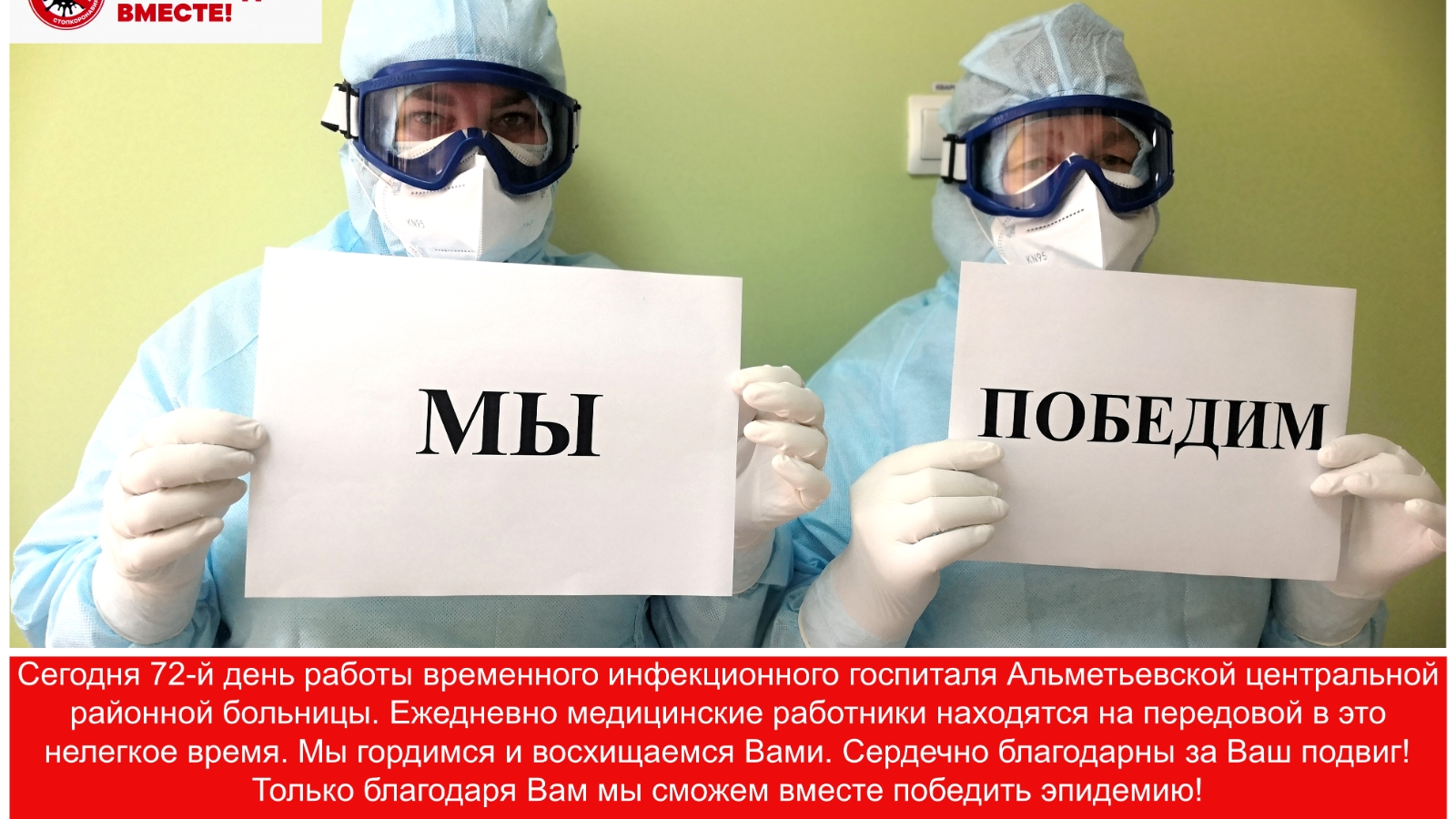 Бүген Әлмәт үзәк район хастаханәсенең вакытлы инфекция госпиталенең 72 нче эш көне. Көн саен медицина хезмәткәрләре бу авыр вакытта алдынгы сафларда . Без Сезнең белән горурланабыз һәм сокланабыз. Сезнең батырлыгыгыз өчен чын күңелдән рәхмәтле! Сезнең ярдәм белән генә эпидемияне җиңә алабыз!
