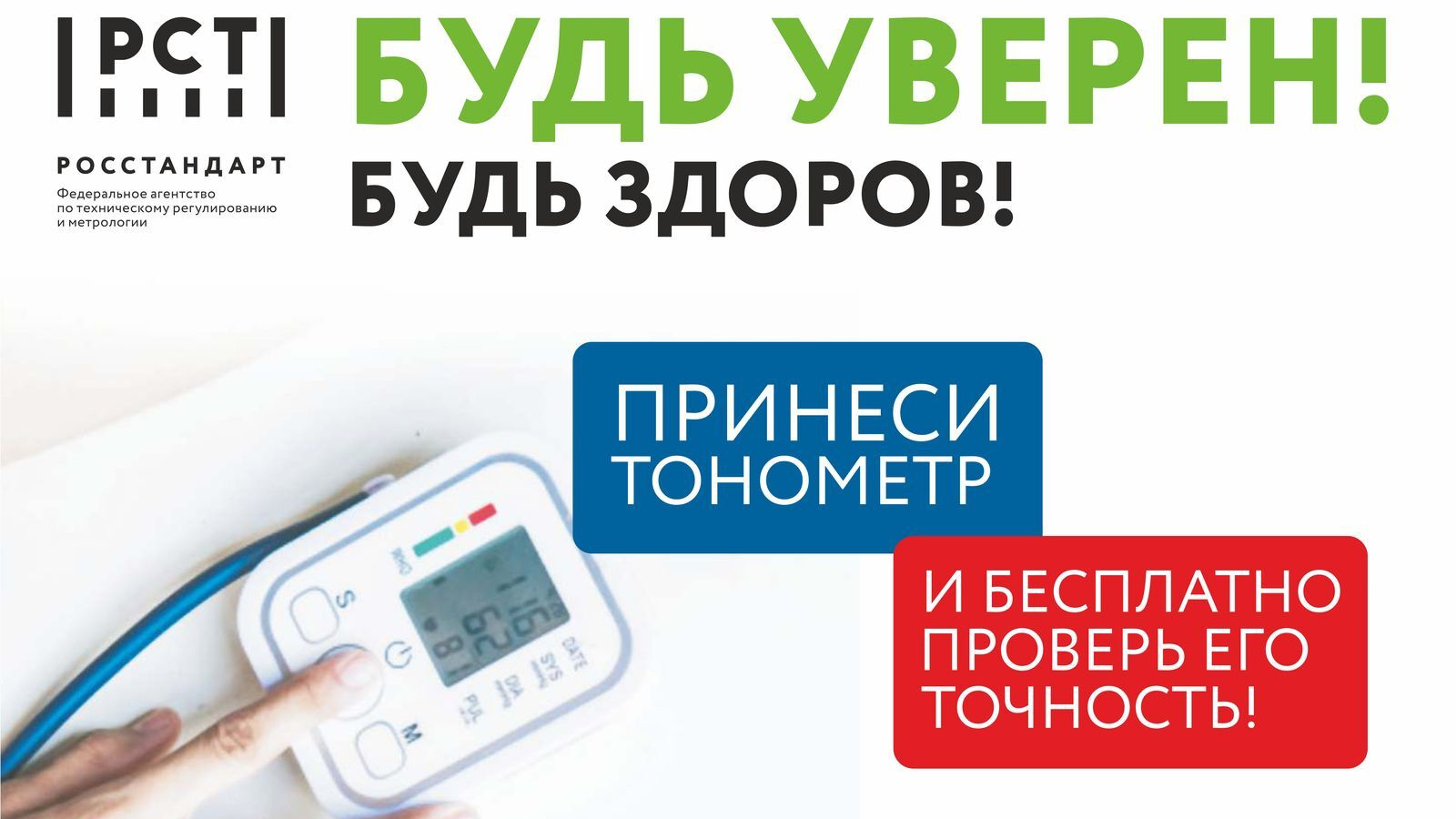 Акция көннәрендә «ЦСМ Татарстан» ФБУ белгечләре халык кулланган көнкүреш кан басымы тонометрларының чыгарылыш параметрларын контрольдә тоту өчен гражданнарны түләүсез кабул итәчәк. Җиһазларны тикшерү нәтиҗәләре буенча, метрологлар тонометр күрсәткечләре турында нәтиҗә генә түгел, ә төзексезлекне бетерү буенча киңәшләр дә бирәчәк.