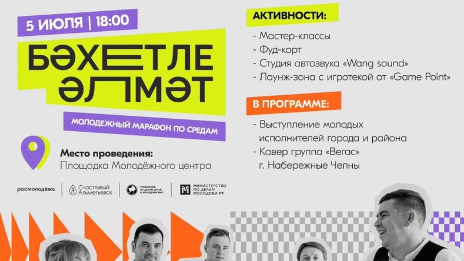 5 июльдә 18.00 сәгатьтә барыгызны да «Бәхетле Әлмәт» яшьләр марафонын ачуга чакырабыз.