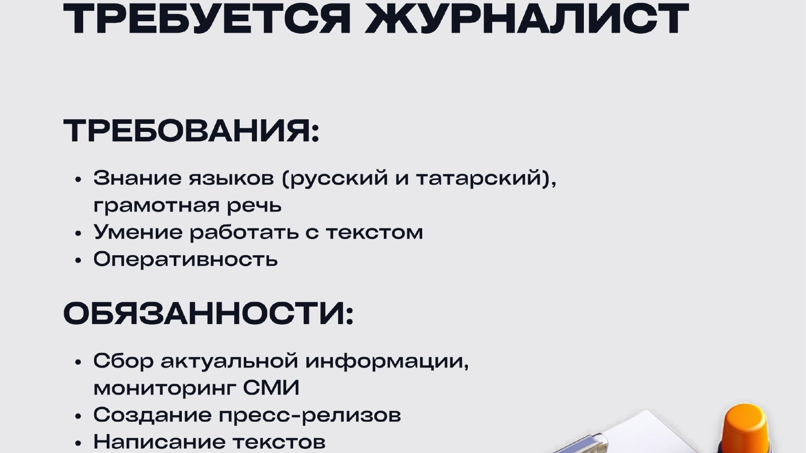 Әгәр син фикерләреңне матур һәм грамоталы итеп текстка яза беләсең икән, синең социаль челтәрләрдә эшләү күнекмәләрең бар һәм медиа өлкәсендә үсәсең килә икән-үз резюмеңны pr-almet@yandex.ru җибәр яисә 8(8553)39-01-49 номерына шалтырат.