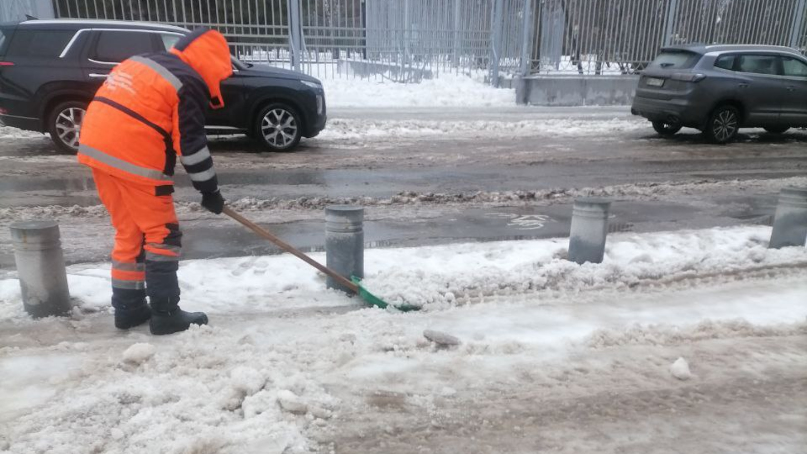 Юл төзүчеләр кулларын сөзәкләмичә эшлиләр: тракторлар һәм кул белән, көрәкләр белән тротуарлардагы бозны җыештыралар.
