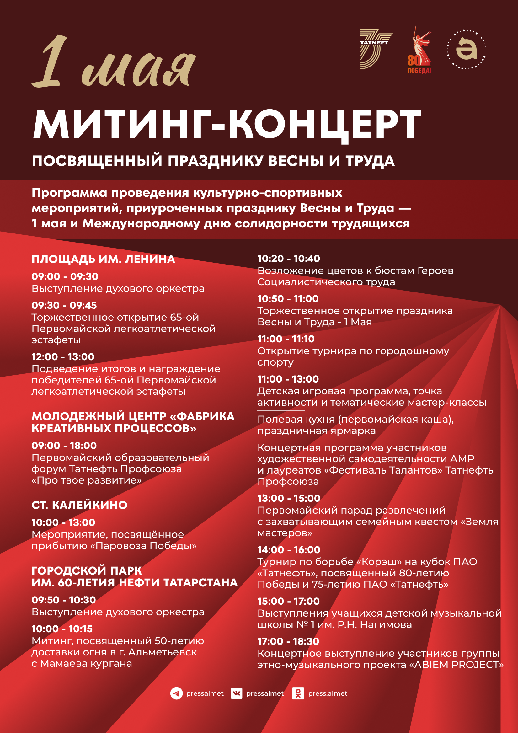 Тантаналы чаралар, җиңел атлетика эстафетасы, концертлар, мастер-класслар һәм башка бик күп нәрсәләр шәһәр халкын һәм кунакларны 1 майда көтә!