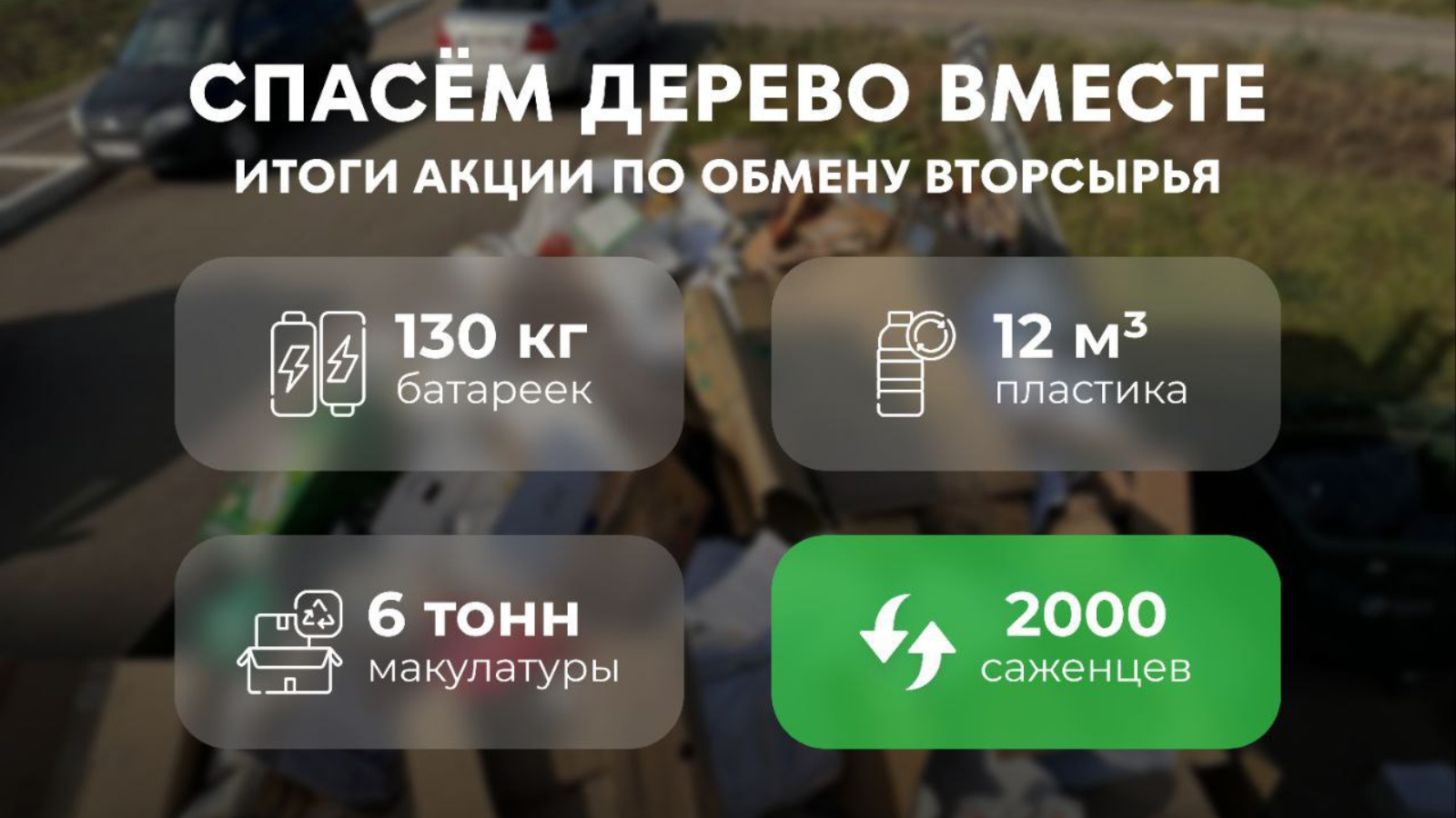 Акция йомгаклары буенча 6 тонна 360 килограмм макулатура, 130 кг кулланылган батарея, шулай ук 12 кубометр пластик шешә, капкачлар һәм башка ПЭТ-чимал җыелды. Алмашка авыл халкы 2000 үсенте - 1500 алма һәм 500 карлыган алды.