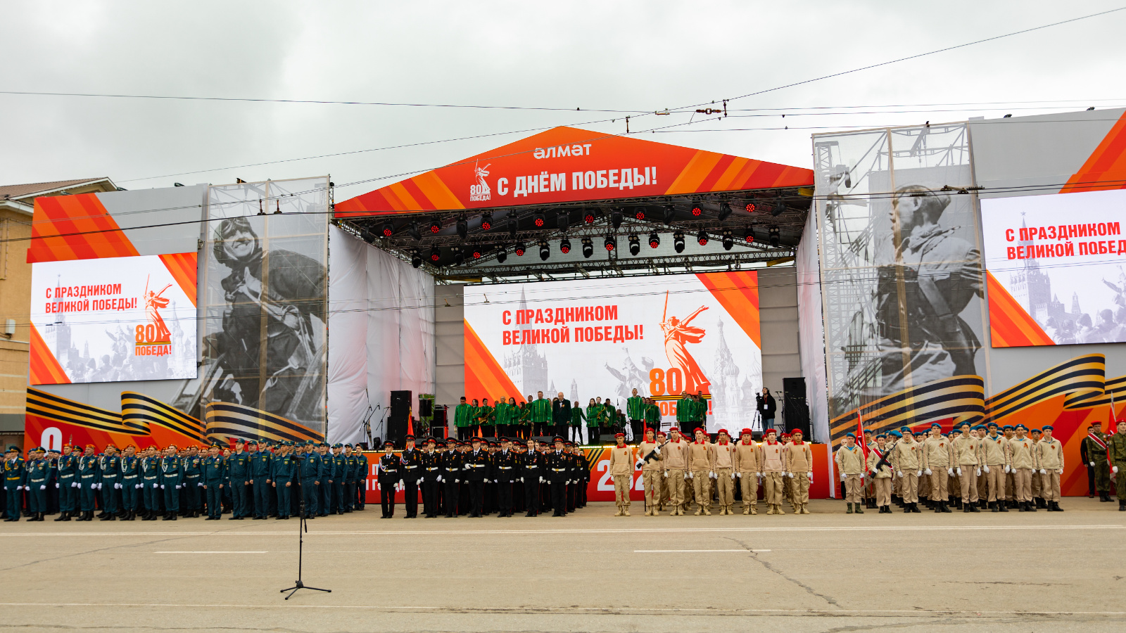 Ленин мәйданында Россия Федерациясе, Татарстан Республикасы Дәүләт флагын һәм Җиңү Байрагын күтәргән Байраклы төркемне трибуна аягүрә басып һәм алкышлар белән каршы алды. Җиңү көнен бәйрәм итү Россия Президенты Владимир Владимирович Путинның котлавын трансляцияләүдән башланды.