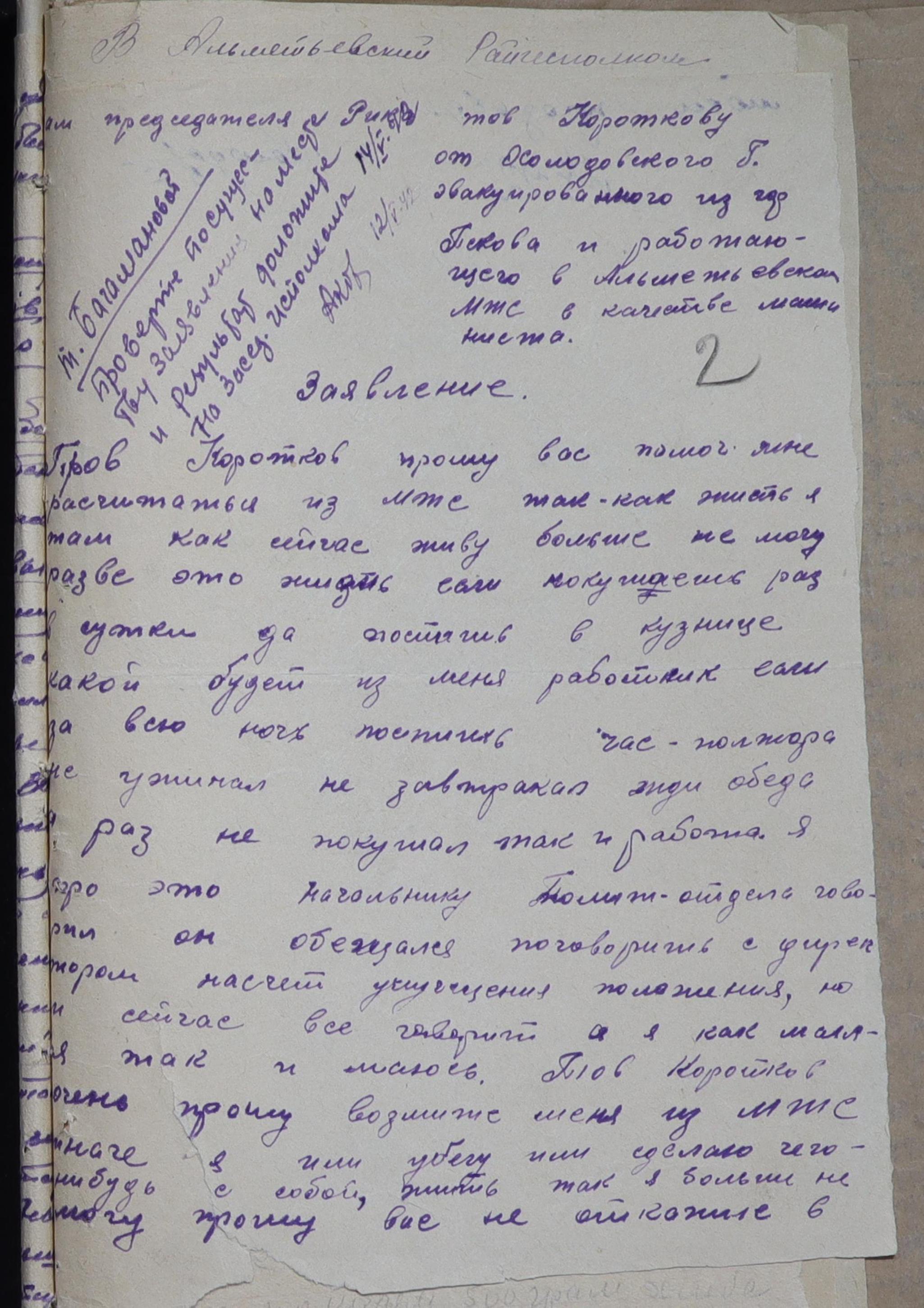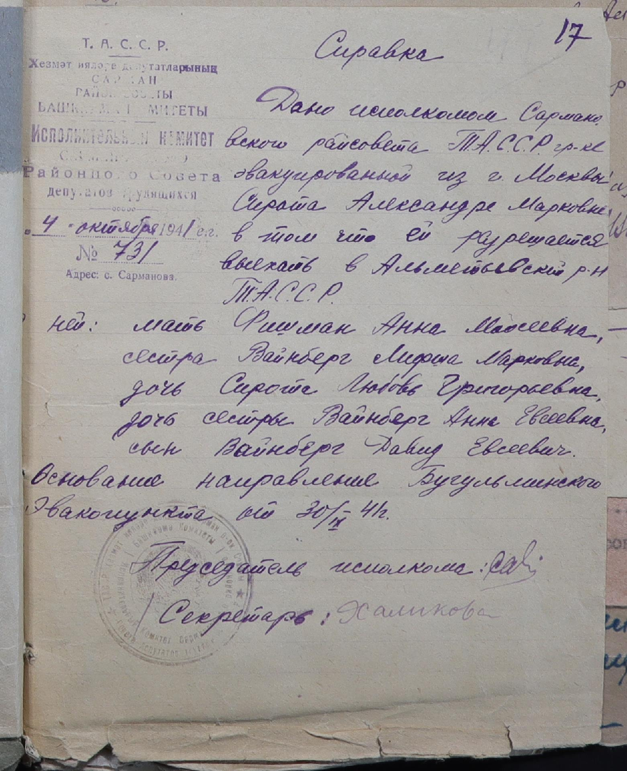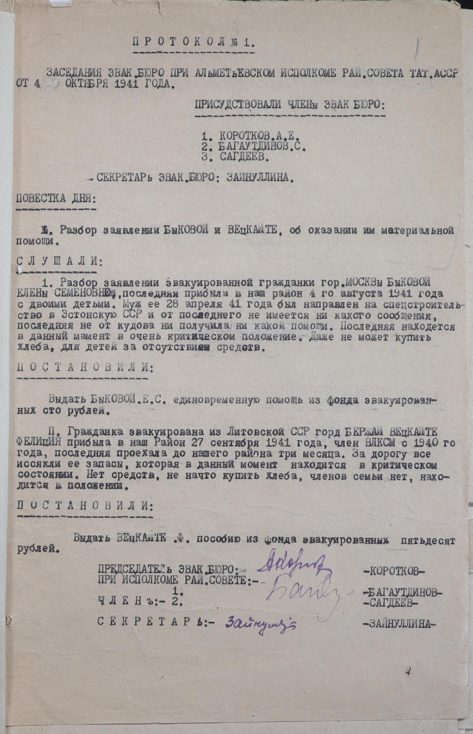 Әлмәт архивында 1941-1943 елларга эвакбюро һәм районга эвакуацияләнгән гражданнарның документлары (хисаплар, ведомостьлар, юлламалар, исемлекләр, таныклыклар, белешмәләр) саклана. Без барыбыз да хәтерлибез, эвакуация бик кыска вакыт эчендә узган, кешеләр үзләре белән кием-салым да, аяк киеме дә, гомумән, паспорттан башка берни дә алырга өлгермәгән. 1941 елда Мәскәүдән эвакуацияләнгән Минһаҗева Зифа: «Мин Габдрахман авылында икенче ел яшим. Сугыш башланган көннән иремнән хат юк. Бөтенесе өзелеп, соңгы әйберләрен сатты. Хәзерге вакытта мин хәтта үз паегымны (7 кило он) сатып ала алмыйм. Миңа кайтарып булмаслык ссуда бирергә ярдәм итүегезне һәм шул акчага сельпо кибетеннән берәр йөк әйбере сатып алу мөмкинлеге бирүегезне үтенәм».